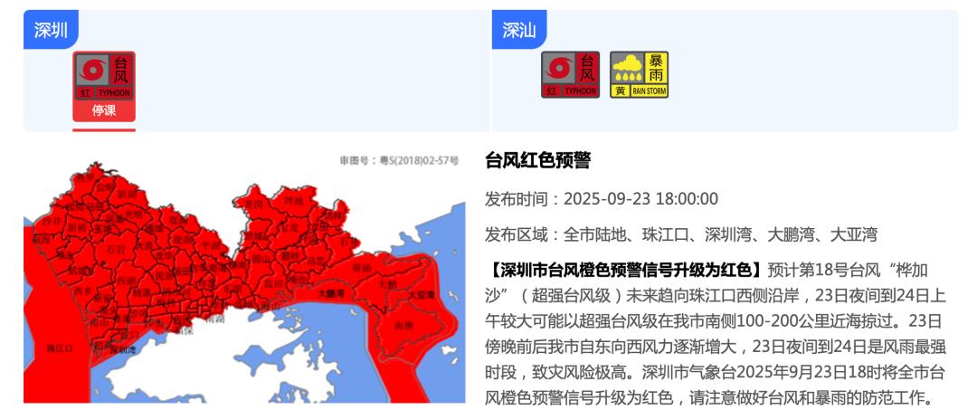 记者从深圳市气象局获悉,预计第18号台风“桦加沙”(超强台风级)未来趋向珠江口西侧沿岸,23日夜间到24日上午较大可能以超强台风级在我市南侧100-200公里近海掠过。23日傍晚前后我市自东向西风力逐渐增大,23日夜间到24日是风雨最强时段,致灾风险极高。深圳市气象台2025年9月23日18时将全市台风橙色预警信号升级为红色,请注意做好台风和暴雨的防范工作。