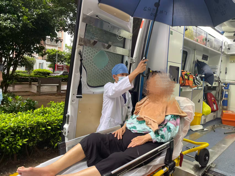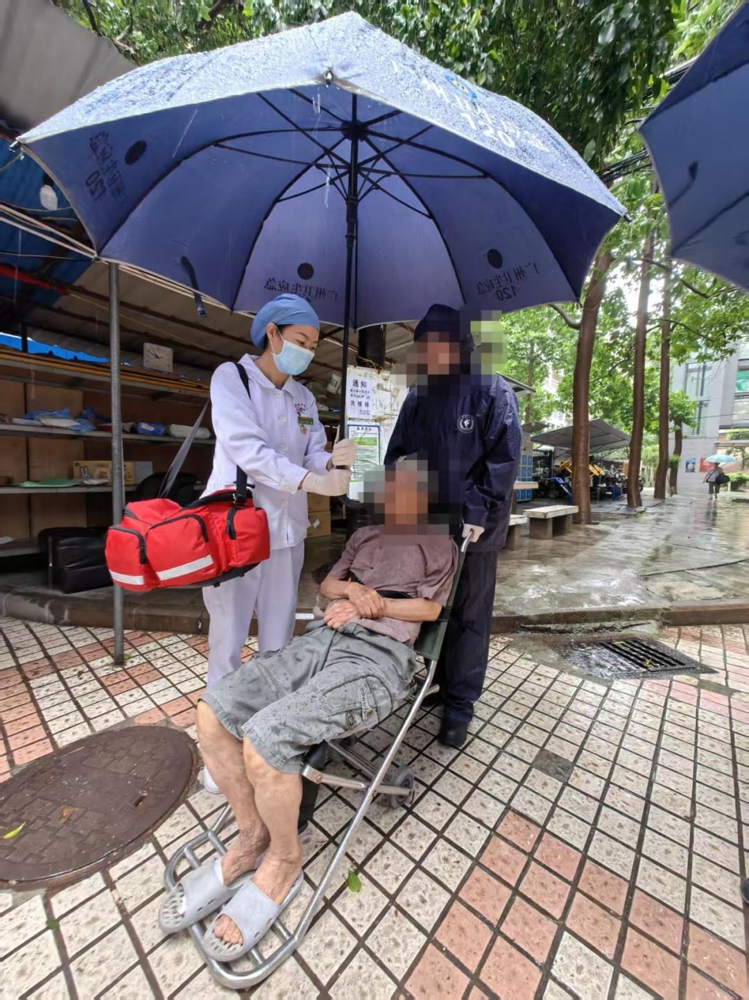 二沙岛分院院前120接诊了一位88岁高龄膝关节疼痛、行动不便的患者,医务人员为其挡雨,提供院前急救服务。