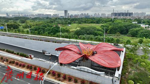 近日,有网友发现海珠湾隧道项目现场“绽放”出一朵巨型“木棉花”。9月21日,记者通过无人机航拍捕捉到这一标志性景观,在番禺区南浦附近的盾构隧道出入口,一朵以木棉花为原型的灯光装置已具轮廓,灯光框架与隧道口结构巧妙融合,既呼应了广州“市花”的城市符号,也为这座即将投用的重要交通工程注入了人文气息。施工人员正紧锣密鼓推进隧道洞口装饰等收尾工作。