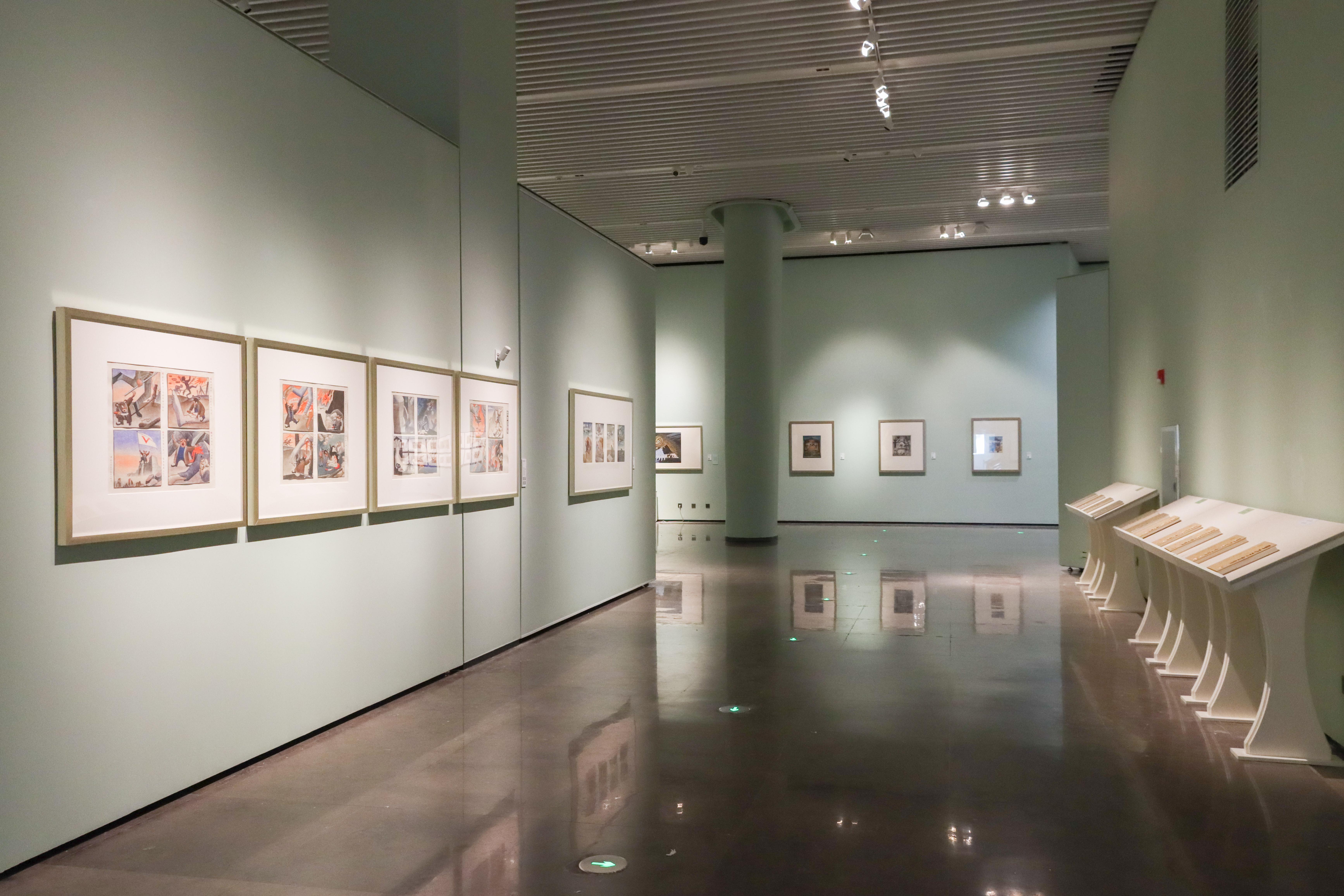展览第一部分聚焦廖冰兄在东北沦陷、华北危机背景下的早期创作,以“揭露侵略本质,唤醒民族觉醒”为核心。第二部分进入全民族抗战时期,廖冰兄的创作转向“讽刺汉奸傀儡,鼓舞军民斗志”。1944年抗战进入战略反攻阶段后,廖冰兄的创作从“战时批判”转向“战后反思”,常以动物寓言揭露战争遗毒与社会弊病——例如《虎王惩贪记》与《猫国春秋》的批判风格一脉相承,通过荒诞剧情,反思“战争不仅摧毁家园,更可能滋生新的不公”,成为中国漫画史上最早关注“战后社会重建”的艺术实践之一。