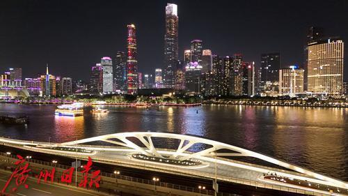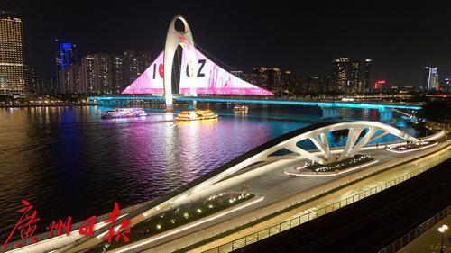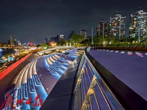 新建的黄埔涌步行桥采用“快慢双道”设计,兼顾通行与休闲,桥身融合岭南文化元素,夜间灯光璀璨,成为珠江夜游新打卡点。项目还增设智能灯光、互动地砖、休憩设施等,提升市民游客的亲水体验,助力广州打造宜居宜游的城市名片。