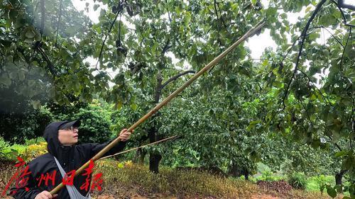 记者上山实地走访,用农民特制的竹竿夹取生长在柿子树高处的柿子。