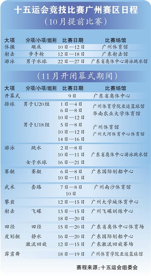 第十五届全国运动会,广州赛区将承办田径、跳水、排球、射击、赛艇、霹雳舞、攀岩等项目,全红婵、苏炳添、吴艳妮等体育明星届时将齐聚广州向金牌发起冲击。