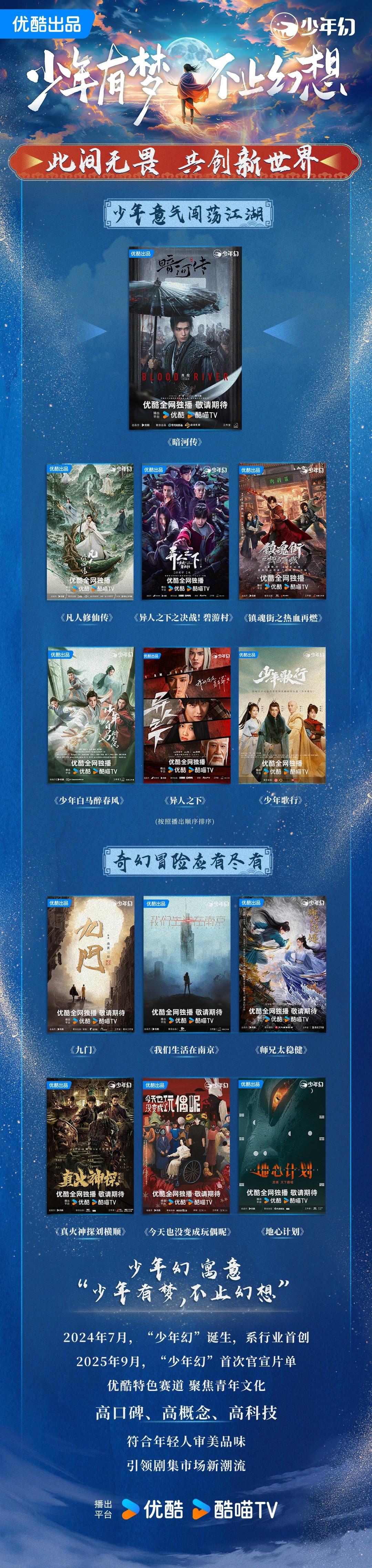 近日,优酷“少年幻”内容主题单元发布片单,共有13部剧集,包含《暗河传》《九门》《我们生活在南京》《师兄太稳健》《真火神探刘横顺》《今天也没变成玩偶呢》《地心计划》7部待播作品。作为优酷特色赛道,“少年幻”聚焦青年文化,以真人漫改、系列化IP、剧漫联动、先进技术为坐标系,致力于打造“高口碑、高概念、高科技”的作品,符合年轻人审美品位,引领剧集市场新潮流。