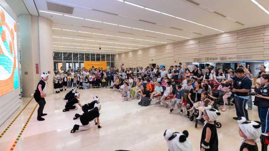 2025年10月12日下午,广州图书馆负一层大堂人潮汹涌,一只憨态可掬的“大熊猫”被一群小熊猫簇拥着走进了“熊猫跃动迎全运,穗蓉同阅绘文旅”的美育成果展开幕式。