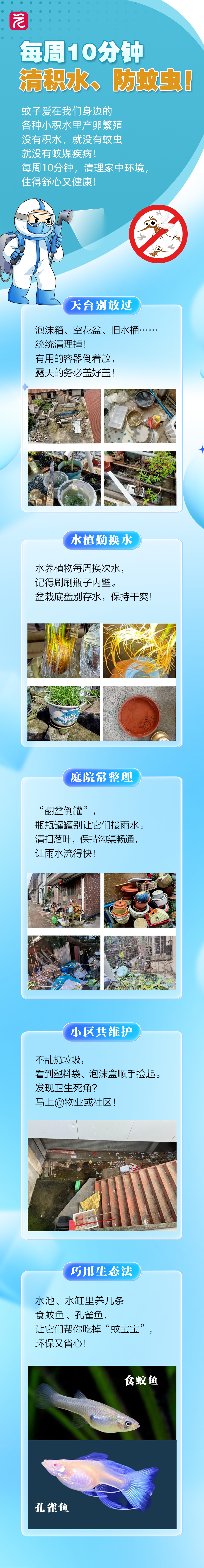 上述区域及周边的机团单位、物业小区、公园和公共外环境管理单位,应加强环境卫生治理,及时清理卫生死角,清运各类垃圾杂物,全面清除各类积水,减少蚊虫栖息和孳生的条件。定期开展灭蚊工作,将蚊媒密度控制在安全水平。