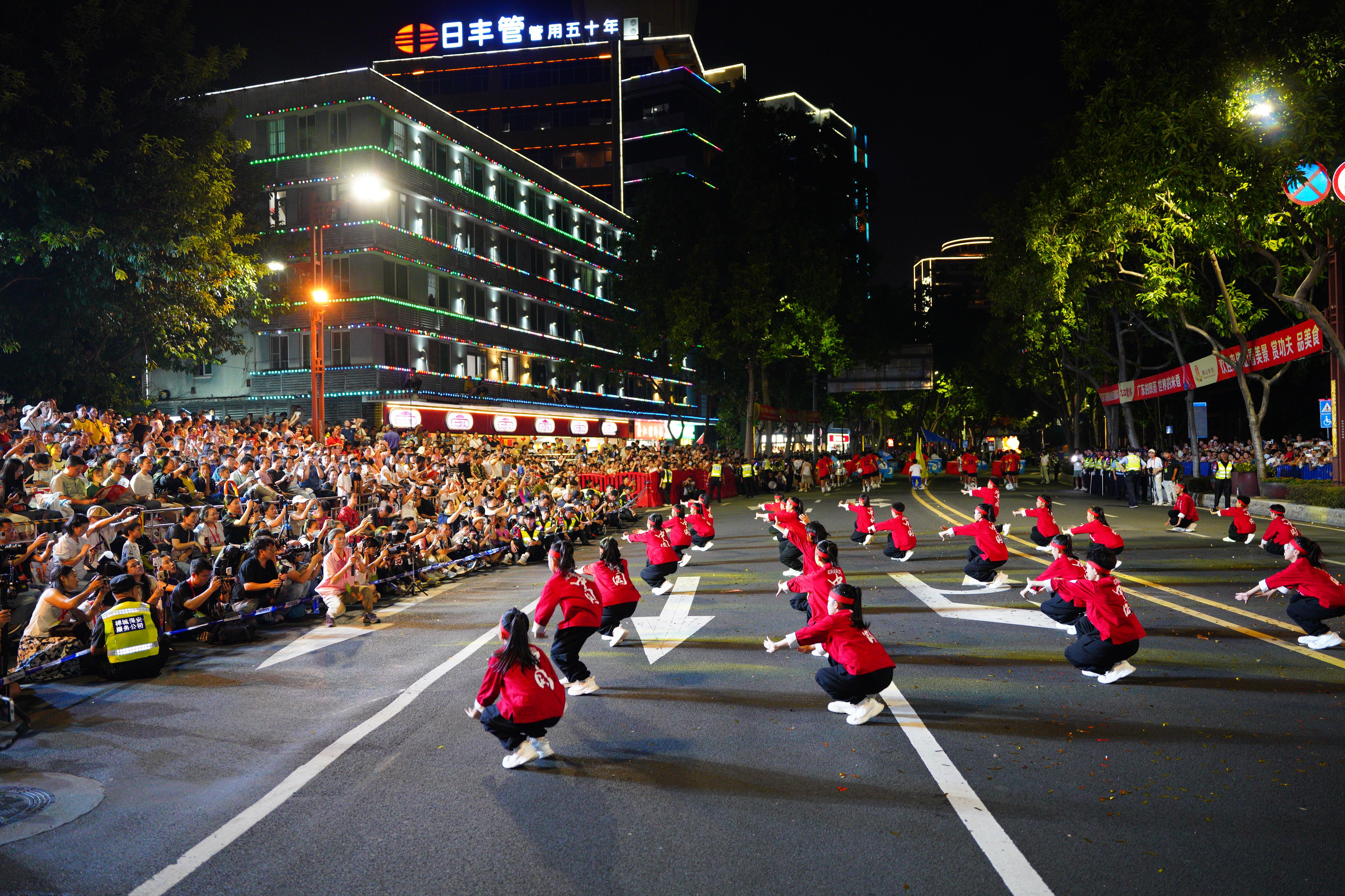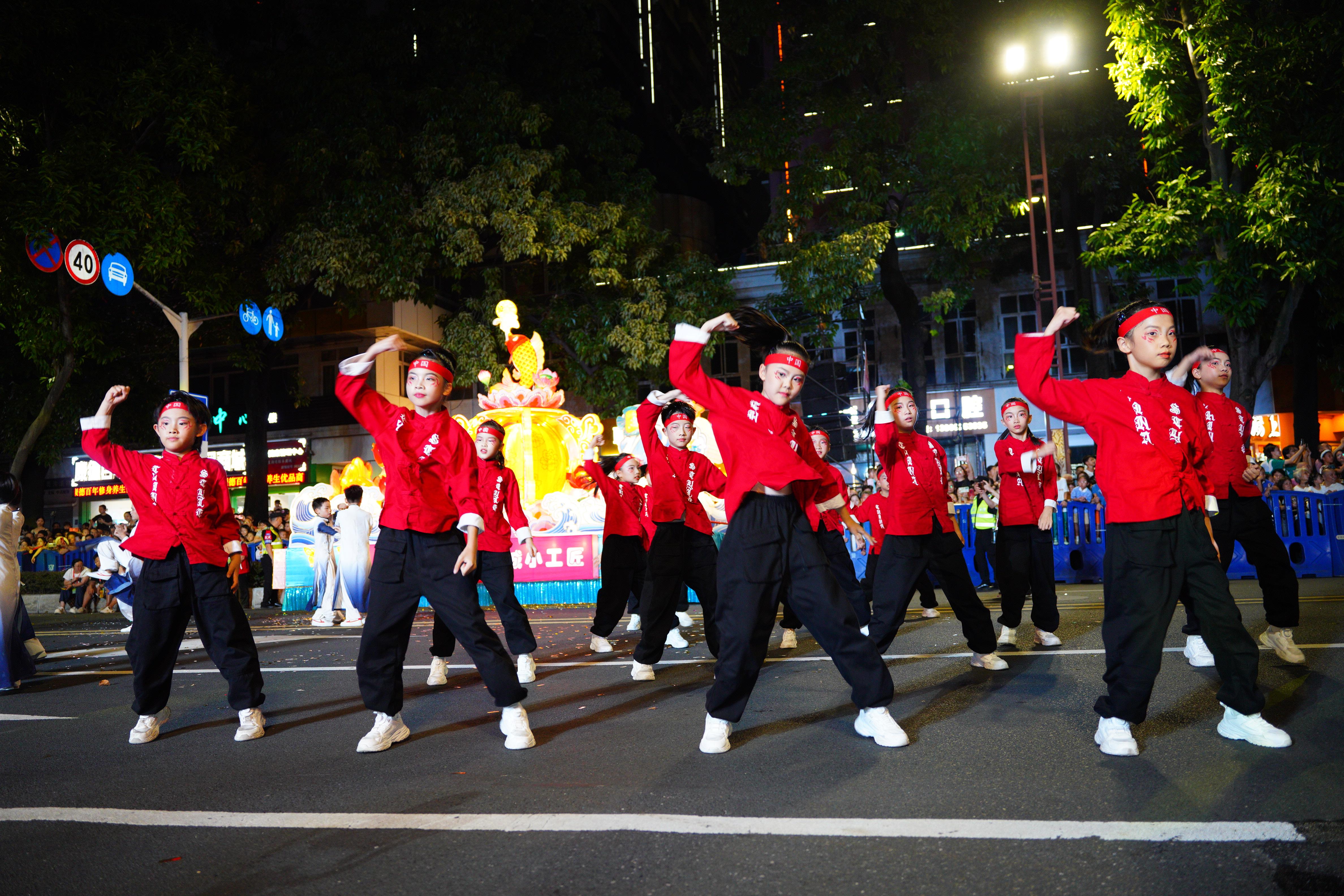 以传统技艺为基础、童趣创意为亮点的“小手彩车”,通过彩灯工艺塑造出鲤鱼吐珠、鲤跃龙门的美好场景,并融入“十周年”主题以及海浪等元素,整体形象活泼灵动,寓意非遗薪火在新一代中延绵不息。紧随其后的表演队伍同样精彩纷呈。来自佛山市禅城区镇安小学的学生们以整齐有力的蔡李佛拳表演,展现出南派武术的刚劲之美;来自佛山市南海区西樵镇民乐小学的学生则以沉稳灵动的咏春拳传递“以柔克刚”的文化智慧。两校学生融合街舞元素,结合拳法动作编排而成的“武·舞”节目,更是成为本次巡游的一大亮点,赢得现场观众阵阵掌声。