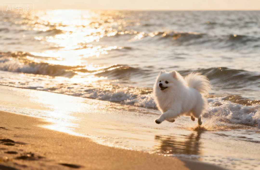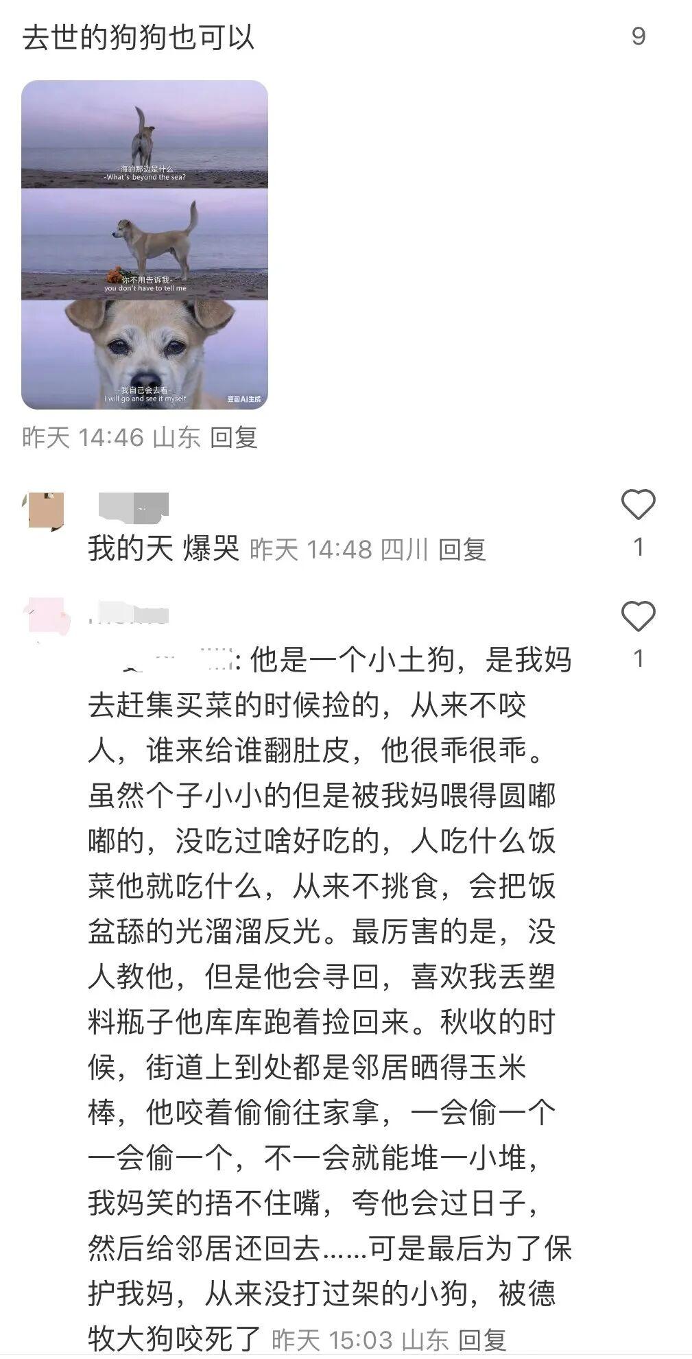 除了去海边,主人们还充分发挥创意,带宠物去大山、森林、河边、草坪各种地方,再拆家的捣蛋鬼,此刻都成了文艺片主角。 于是评论区里也一派和谐,大家都沉浸在自己的艺术中无法自拔。 当然也有广东人别出心裁......(具体指令可以去相关评论区找) 在热闹的评论区里,一些借助AI与爱宠“重逢”的留言格外真挚动人。当熟悉的形象跃然眼前, 那一刻,仿佛它们从未离去 。 别人看见的都是海,有网友却给陪伴自己17年的猫猫,许愿一个无边无际的猫砂盆。 那些曾失去宠物,在评论区里分享AI生成图的人们,在与有相同经历的人的交流中,释放感情,得到了安慰。去世的狗狗们,又像过去一样,把素不相识的人们连结在一起。 晚霞将天空染成一片温柔的粉蓝,漫向海平线。无垠的大海披着淡蓝色的柔光,与天际浪漫相接,主人的目光穿越照片,与爱宠一同眺望,仿佛时间在此刻也变得缓慢而深情。