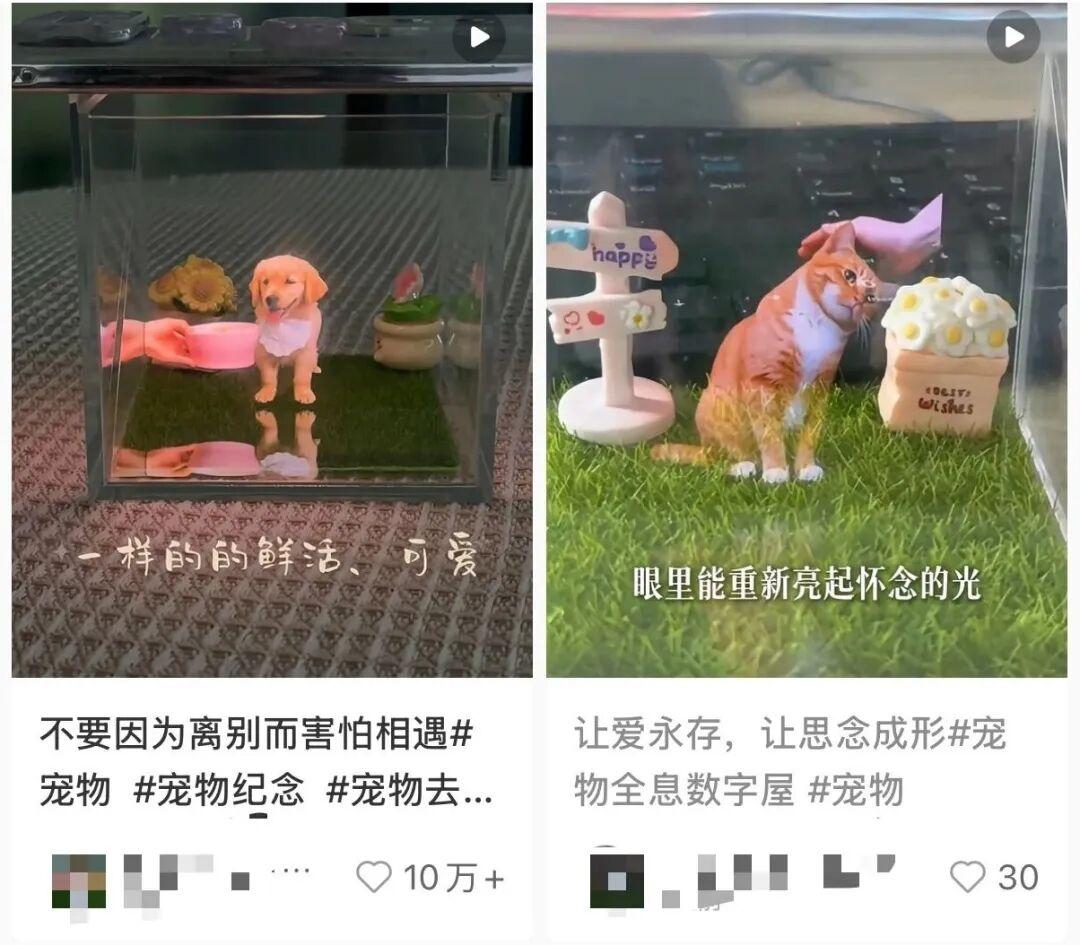 在技术的帮助下,心心念念的爱宠不仅能出现在二维的照片里,还能在三维的空间里动起来,与主人“再见一面”。 据网友黑皮臭臭介绍, 今年5月,他尝试用AI制作自家猫的全息投影视频:先用AI将宠物的一张照片转化成黑色背景,再输入动作指令(比如让宠物舔爪子、摸摸头等),就可以用照片生成视频。 之后再选购自己喜欢的微缩小屋 模 型 ,在小屋四周装上pvc透明板或亚克力透明板, 拼接好小房间,把透明板45°放在小房间,顶部用卡纸开个洞,最后把手机放上去,打开视频,就能让毛孩子“住”进新房子里。 除了自己用AI制作宠物投影,在相关购物平台上,还出现了一批提供定制宠物全息投影服务的商家,服务均价在50-80多元不等。 据其中一位商家介绍,购买服务后,只需将一张宠物照片上传到对应的app上,即可自动生成全息投影视频,再将手机放在透明的玻璃盒上,就能看见动起来的宠物。 花几十块钱,就能重新见到心心念念的它,这样的买卖让不少人心动。有网友表示,自己买回来之后,发现快递包装有些问题,本想退货,但商家提议“你先用一下”,她打开后,看到心爱的小狗像从前那样坐着对自己摇尾巴,便一度哽咽:“没有必要退了......” 有网友说:这是AI最有用的一次,让我又见到心爱的它。 广州日报媒重点实验室出品