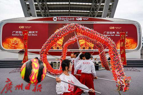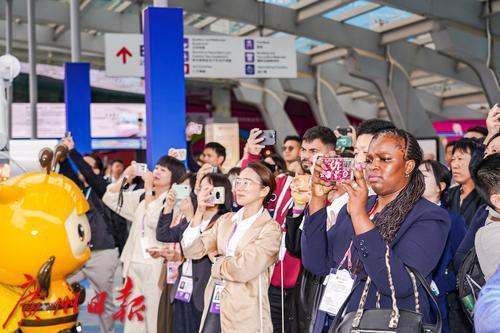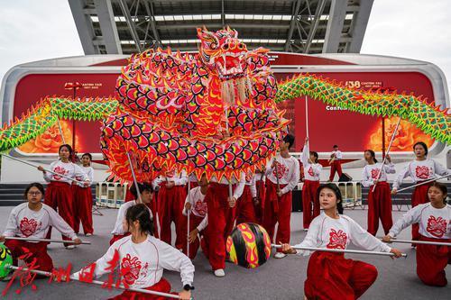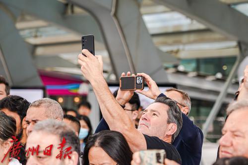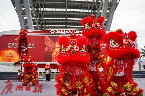 开幕仪式上,采购商高高举起手机拍摄极具广府特色的舞龙舞狮表演。