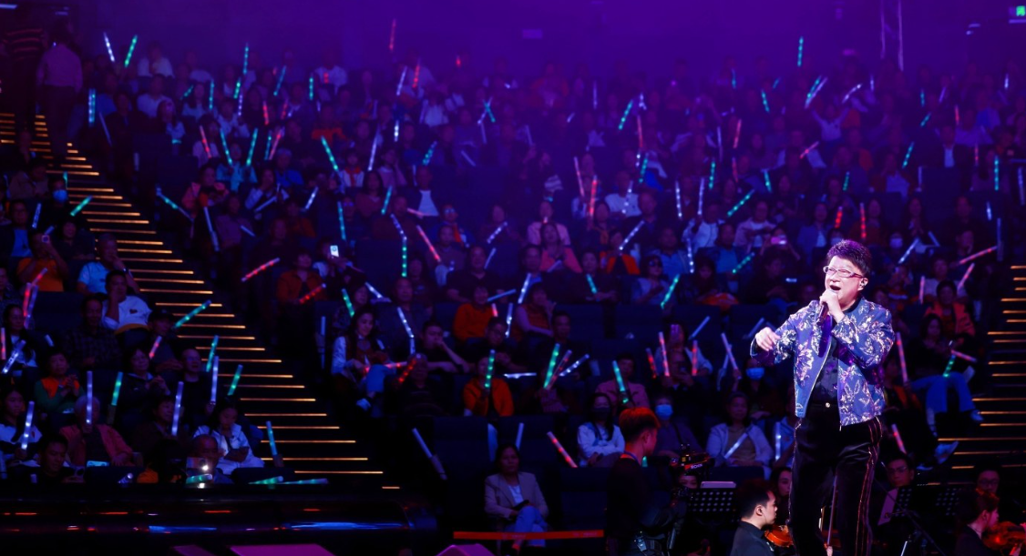 演唱会在35人大型乐队的现场伴奏中拉开帷幕。徐小明博士接连献唱《大号是中华》《万里长城永不倒》《木棉袈裟》《柳叶船》《大地恩情》等时代金曲。当旋律响起,瞬间唤醒了几代人的共同记忆,激荡起全场观众强烈的家国共鸣。