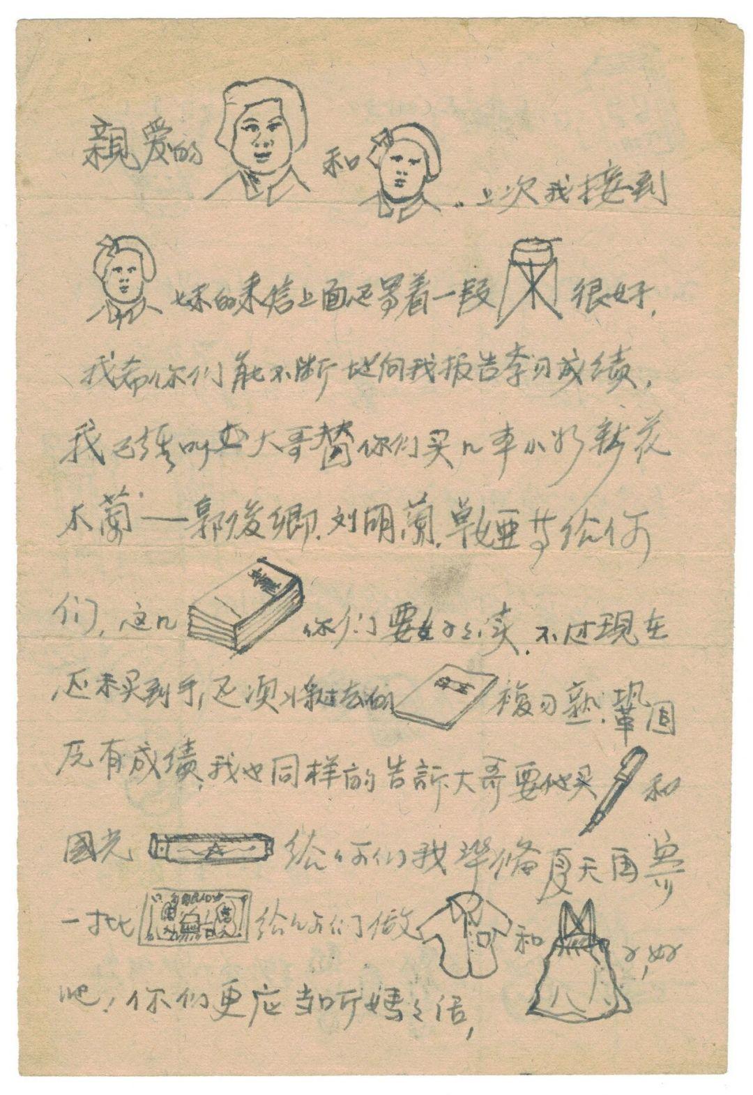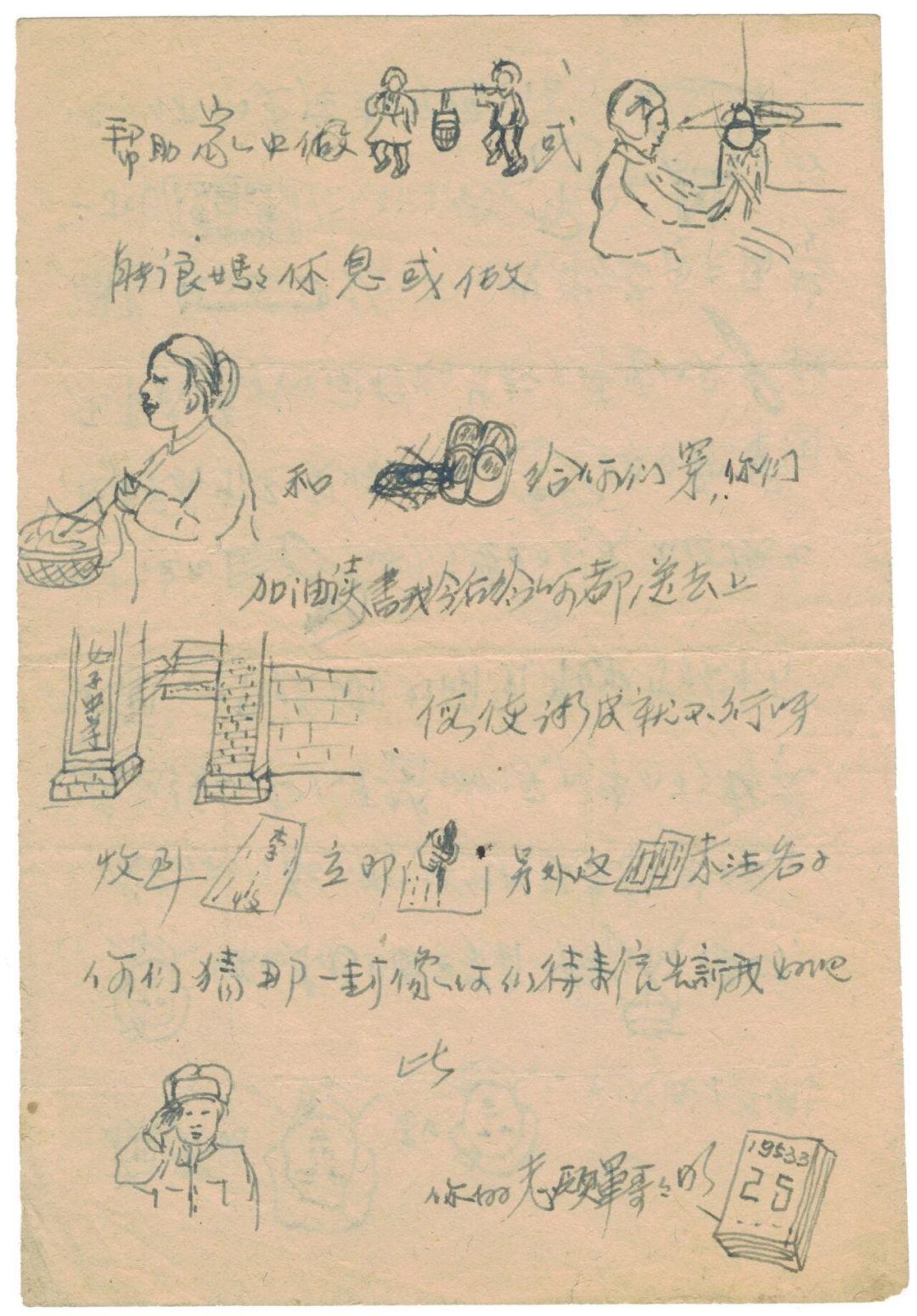 再比如,作为第24军70师208团教导队的文化教员,李征明给妹妹们的信非常活泼俏皮,间穿插着各种“表情包”似的涂鸦。例如,信首称呼处,他没写名字,而是画上几个女孩头像,让妹妹们看图猜测哪封信属于自己,像隔着千山万水同她们嬉戏。