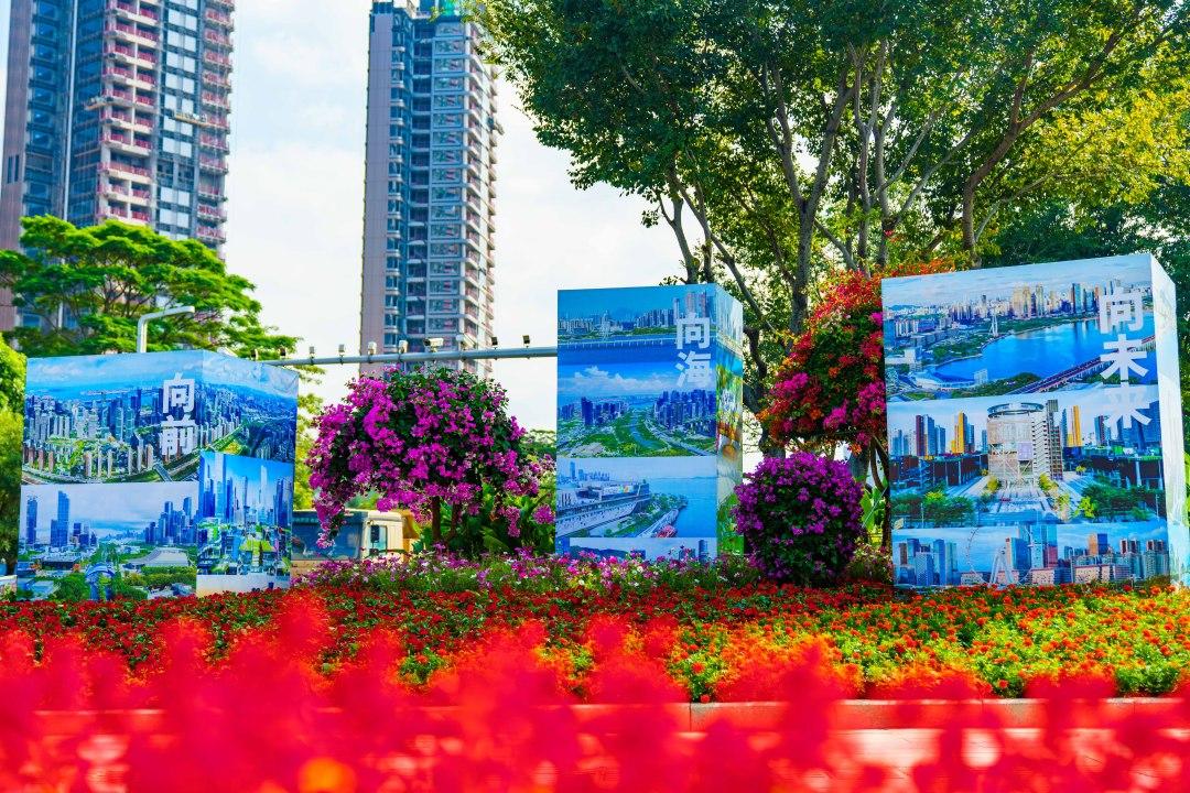 漫步前海街头,全运元素与城市肌理完美交融。前海大道、听海大道、梦海大道等主干道两侧,数百面全运主题灯杆旗迎风招展,与街角“喜洋洋”“乐融融”两大吉祥物打卡点相映成趣,不少市民带着孩子驻足留影。前海商圈的巨型LED屏上,全运会宣传片不断播放;写字楼挂上了全运会海报,就连城市绿化也换上了“全运盛装”——以“同心共筑,花韵流转”为主题、一簇簇色彩交织的花境沿着道路延伸,既像流动的“全运彩带”点缀城市间,又与沿线灯杆旗、吉祥物打卡点形成呼应,随手一拍皆是氛围感大片。