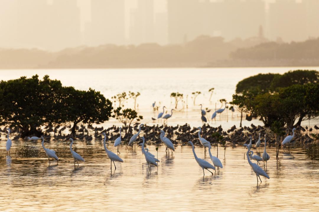 深圳位于全球9大迁飞通道中,覆盖国家范围最广、迁飞鸟类数量最大的“东亚-澳大利西亚”候鸟迁飞通道中点。香港米埔和福田红树林国际重要湿地环绕的深圳湾,每年接待约十万只候鸟前来越冬和停歇,黑脸琵鹭等珍稀鸟类频频现身。水天一色、鸟类翩飞、人与鸟类和谐共处的场景,已经成为深圳的特色景致。