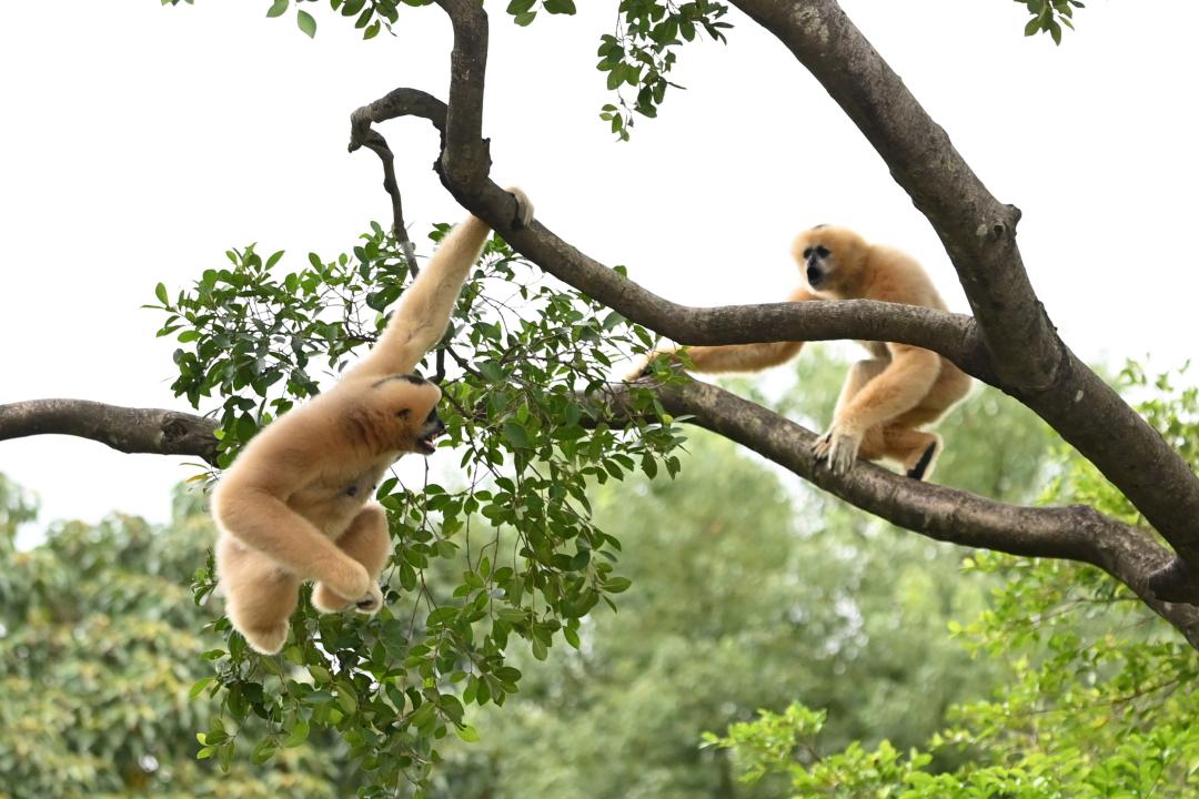在动物园长臂猿岛展区看到,长臂猿在树上用前肢抓住树枝,把整个身体吊起来,在树冠间迅速摆荡,当达到弧线最高点时果断放开前肢,将身体抛出,连续做出从一条树干攀到另一条树干的动作,一气呵成,每一次都“出手不凡”,穿梭在树冠间。“长臂猿的前臂长度约为身体长度的1.5倍,这双长臂是它们展现自己的独门绝技‘体操’,在高速摆荡中能够精准改变方向,躲避障碍,准确抓住树枝,是动物界天生的‘体操健将’。”饲养员说。