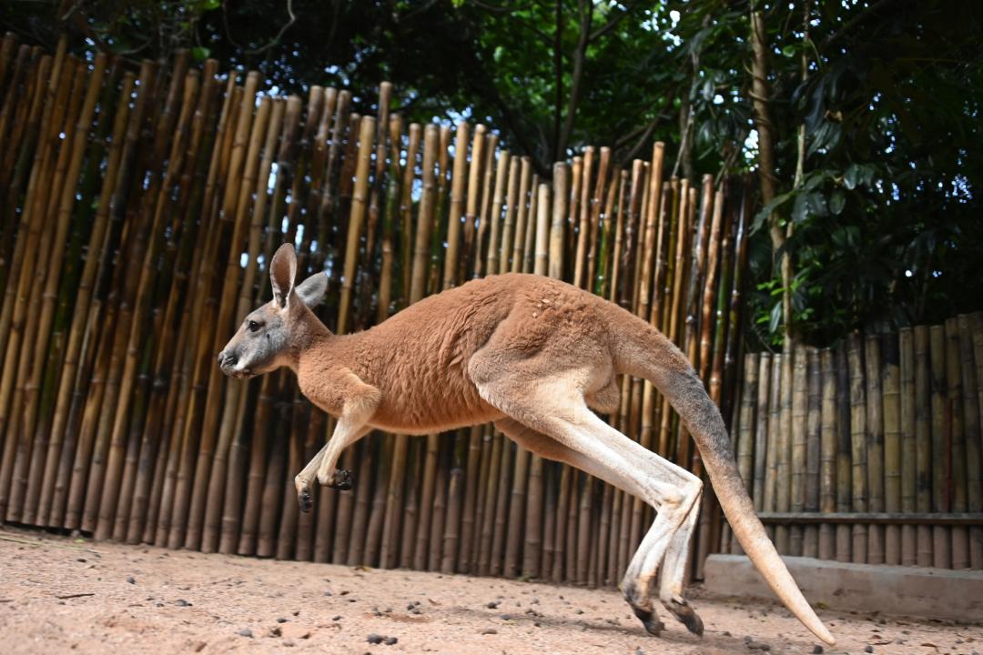 袋鼠园里,三五成群的袋鼠—有的在吃着食物、有的躺在沙地上憩息、有的陪着小崽一起玩耍。动物园饲养员介绍,别看它们平时安静的样子,当它们跳跃起来,立定跳远也能够跳出约2.5米,在快速连续跳跃中能跳出更远的距离,袋鼠的后肢比前肢强壮,通过强健的后腿和尾巴的协调助力更远的跳跃,是动物界的“跳远健将”。