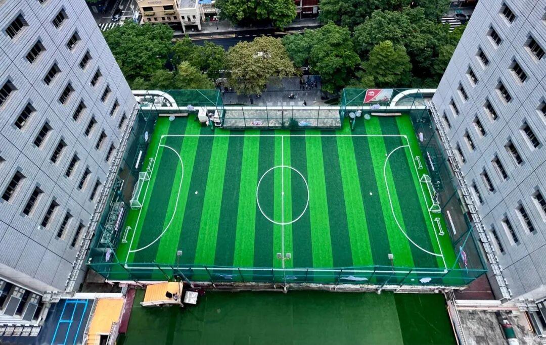 位于江湾阳光天地的麦斐体育足球场,创新利用了“空中”城市空间。这片充满活力的绿茵场,并非建于传统地面,而是巧妙借助了两栋高层建筑之间的天台空间改造而成。昔日闲置的天台,如今变成了足球爱好者挥洒汗水、追逐梦想的空中赛场,缓解了老城区地面运动场地不足的难题。