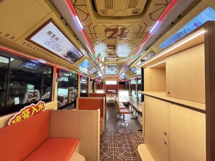 在“铛铛巴士”首发启动仪式上,该主题巴士的首次公开亮相。记者看到,“铛铛巴士”在设计上深度融合岭南文化元素,融合骑楼轮廓、醒狮与粤剧人物图案;在车厢的内部更是精心布置,为乘客营造沉浸式文化体验场景,从车厢的地板、车身内的广彩瓷画到展示陈列柜,每一处细节都彰显了独特的羊城韵味。在车厢内还配备了专业的音响系统,使播放的音乐饱满而富有层次,营造出浓郁的广府文化氛围。
