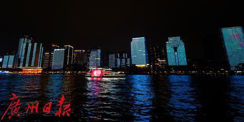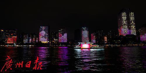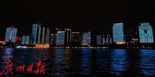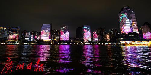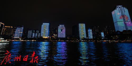 11月12日,沿江路的建筑亮起十五运会主题的灯光,点缀珠江夜色。