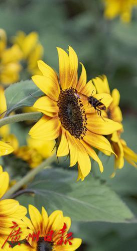 向日葵秋日盛开,一只蜂儿前来采蜜。