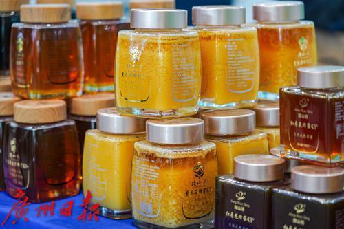 现场各类新疆特色产品琳琅满目,图为蜂蜜。