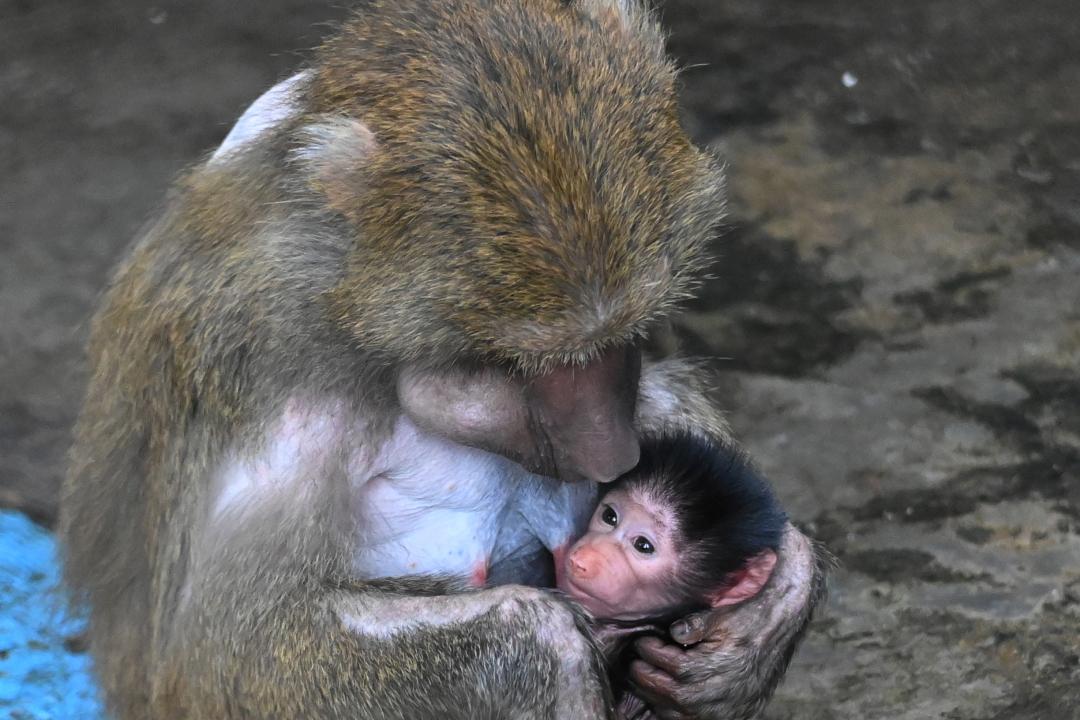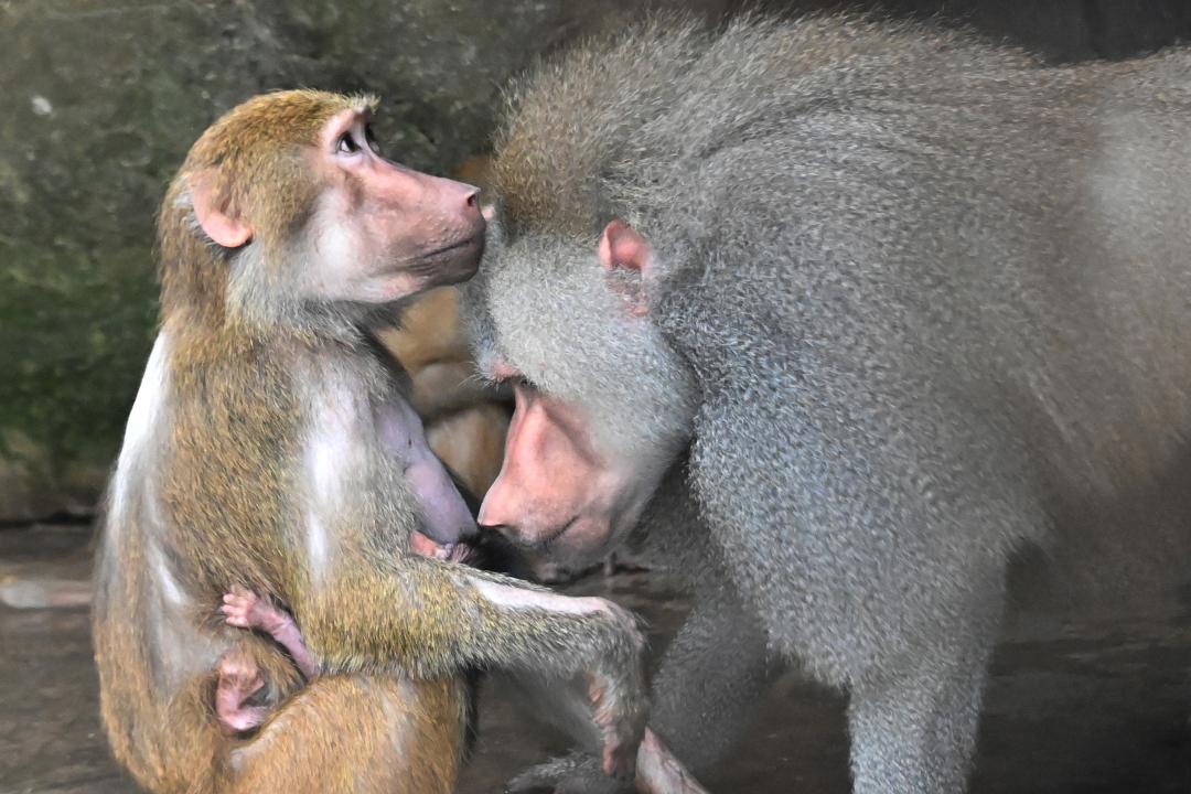 在动物园猿猴村看到,周围稍有动静,母狒狒立即抱着小狒狒躲到隐蔽的地方,并侧着身体小心翼翼护着小狒狒。公狒狒同样对小狒狒疼爱有加,时而用嘴接触小狒狒。饲养员为母狒狒准备了“月子营养餐”,母狒狒喜欢把好吃的食物存在腮帮子里,腮帮子鼓鼓的,然后慢慢地咀嚼享用。“母狒狒带崽经验丰富,对小狒狒照顾得特别周到,小狒狒茁壮成长,半岁以后逐渐断奶。”饲养员说。