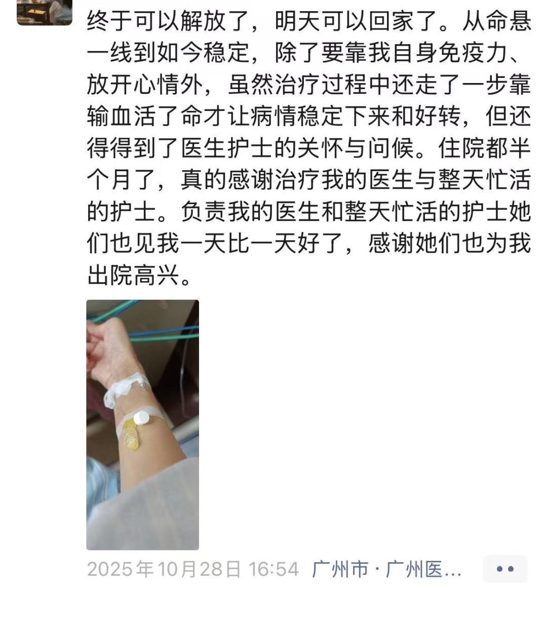 “住院都半个月了,真的感谢帮我做治疗的医生与整天忙活的护士……见我一天比一天好了,她们也为我出院高兴。”出院时,小美开心感谢医护,在朋友圈感慨“终于可以解放了。”
