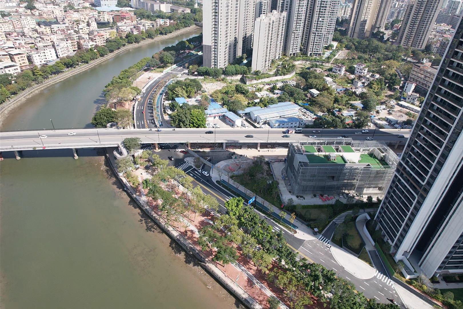 这条生态碧道的建成得益于一条车行路的“让路”。花地河东侧路(浣花西路-茶滘涌段)(中段)原先是一条只有六七米宽的两车道,随着周边大型小区的陆续建成,居民出行需求和管网排水需求陡然提升,使得这条路的拥堵、排水问题日益凸显。2023年,荔湾区主导、联合沿线开发商,启动对该路段的改造,通过拆除道路沿线旧厂房、腾挪优化空间,将贴着河岸的车行道向另一侧移,并拓宽为1.7公里长、26米宽的双向四车道。道路的优化为花地河东岸新增一条南北向四车道交通要道,打通封闭长达20余年的浣花西路、丰年路,花海街、茶滘路等4条断头路。同时为碧道的建设腾出了宝贵的河边空间。