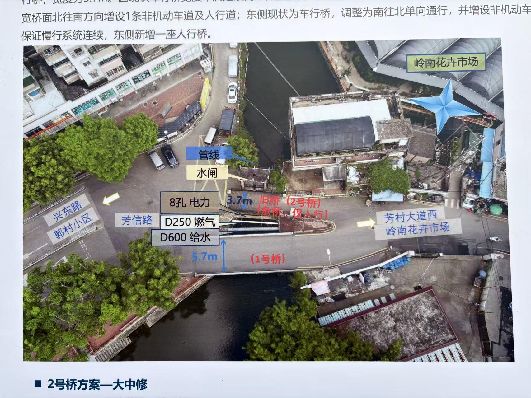 今年7月17日,位于石围塘街道芳信路的郭村水闸桥改造工程顺利完工,芳信路郭村水闸桥路段实现双向分流通行,整条道路的承载能力得到显著提升。郭村水闸桥位于芳信路中段,横跨郭村涌,原先有新、旧两座桥梁,新桥为5.7米宽的车行桥,仅供单向通行,旧桥与水闸共建,仅3.75米宽,容纳行人通行,且桥体裂缝蔓延、结构老化,被专业机构鉴定为危桥,这一小段路也成为岭南花卉市场片区的“瓶颈路”。项目承建方工作人员杨晓东介绍,改造项目在今年4月动工、7月完工,芳信路从水泥路升级为沥青路,郭村水闸桥升级改造后,单侧宽度由3.75米增至6.5米,实现双向分流通行,并留出一条人行道,“人车抢行”“会车困难”等问题得到实质性解决,通行更加安全。