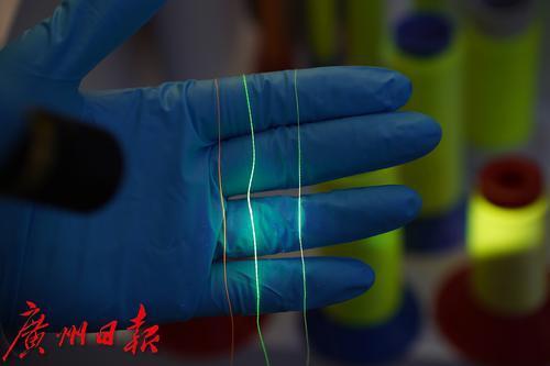 AIE荧光纤维,它在自然光下呈现白色或彩色,365nm紫外光激发后可发出强烈的荧光色彩。AIE荧光纤维具有荧光亮度高、耐水洗性能好,适用纤维材料广等优点,可应用于织物服装、证券票据等领域的防伪。