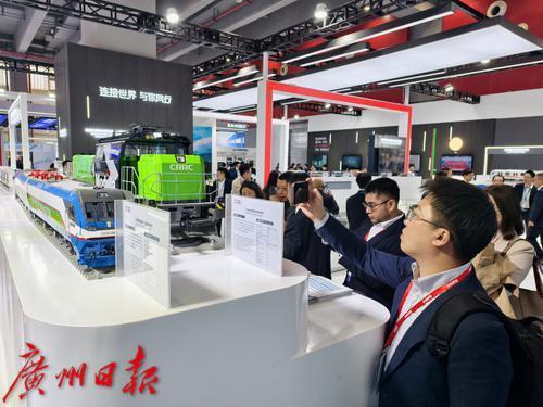 客商和嘉宾在参观展会上中国中车展出的轨道交通列车模型。