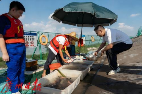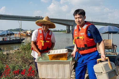 下午时分,在佛山市顺德水道的龙翔大桥下游段,中交广航局顺德水道项目部的工作人员提前来到河堤围蔽处。他们熟练地移开一部分绿色金属网,拉起警戒带,摆好三把大型遮阳伞和若干塑料凳,最后从项目部搬来一箱清凉饮料。