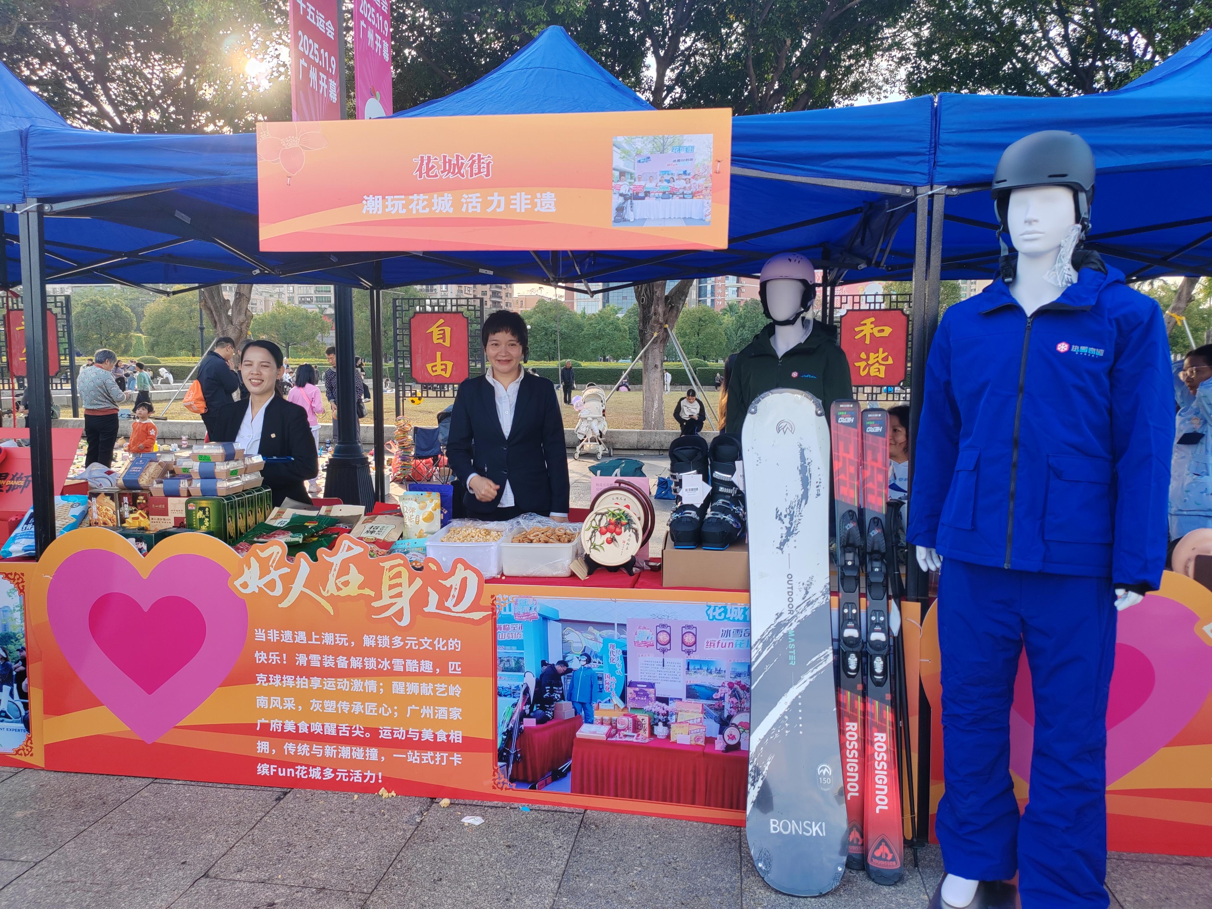 其中花城街摊位的口号是“潮玩花城,活力非遗!”在这里,滑雪装备解锁冰雪酷趣,匹克球挥拍享运动激情;醒狮献艺岭南风采,灰塑传承匠心;广州酒家广府美食唤醒舌尖。运动与美食相拥,传统与新潮碰撞。