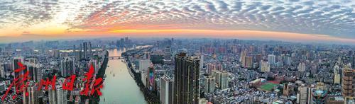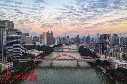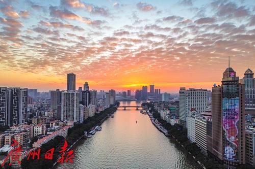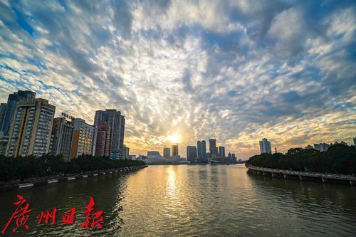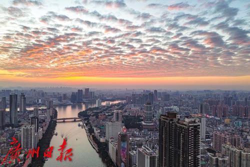 11月23日,远眺夕阳、鱼鳞云下的白鹅潭和珠江航道。