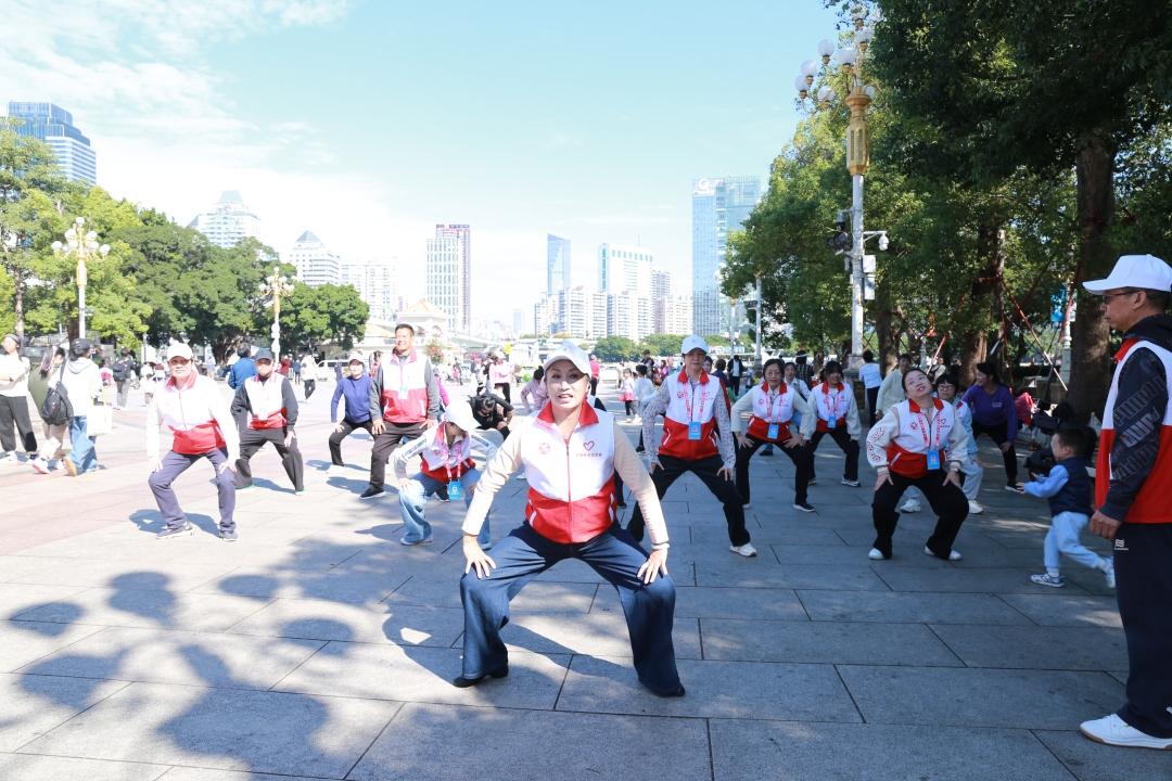 在全运助威操教学区,市民跟随着动感节拍,在志愿者的带领下学习助威操动作。志愿者一边示范伸展、踢腿、跳跃等动作,一边向参与者讲解:“这套助威操是一项很好的健身运动,它包含了全身协调性训练,让每个人都能享受运动、参与全运。”市民们随着节拍挥臂、跳跃,高涨的热情与动感的音乐汇成一道生动的风景。而一旁的八段锦教学则是另一种风格,在专业志愿者的带领下,参与者们凝神静气,不疾不徐地进行着拉伸、上举等动作。