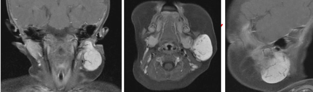 小柚子三个月大时,父母无意中摸到他的左侧脸颊有个小肿物,触摸时孩子似乎没什么感觉,家人便没放心上。不料肿物两个月后便长至鸽子蛋大小,当地医生建议排查是否为腮腺肿瘤。于是,小柚子的父母带着孩子来到广州医科大学附属第三医院小儿外科求医。
