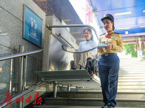 上午10时30分左右,白云大道北站接到康女士的预约,将使用轮椅从A2出入口进站乘车。按照约定时间,值班站长陈琳来到出入口接上康女士。轮椅进站需要用到楼梯升降机,陈琳启动机器,固定好轮椅,一路护送,确保轮椅上的康女士从地面安全进入站厅。其后,通过垂直电梯,乘客顺利从站厅到达站台层候车。