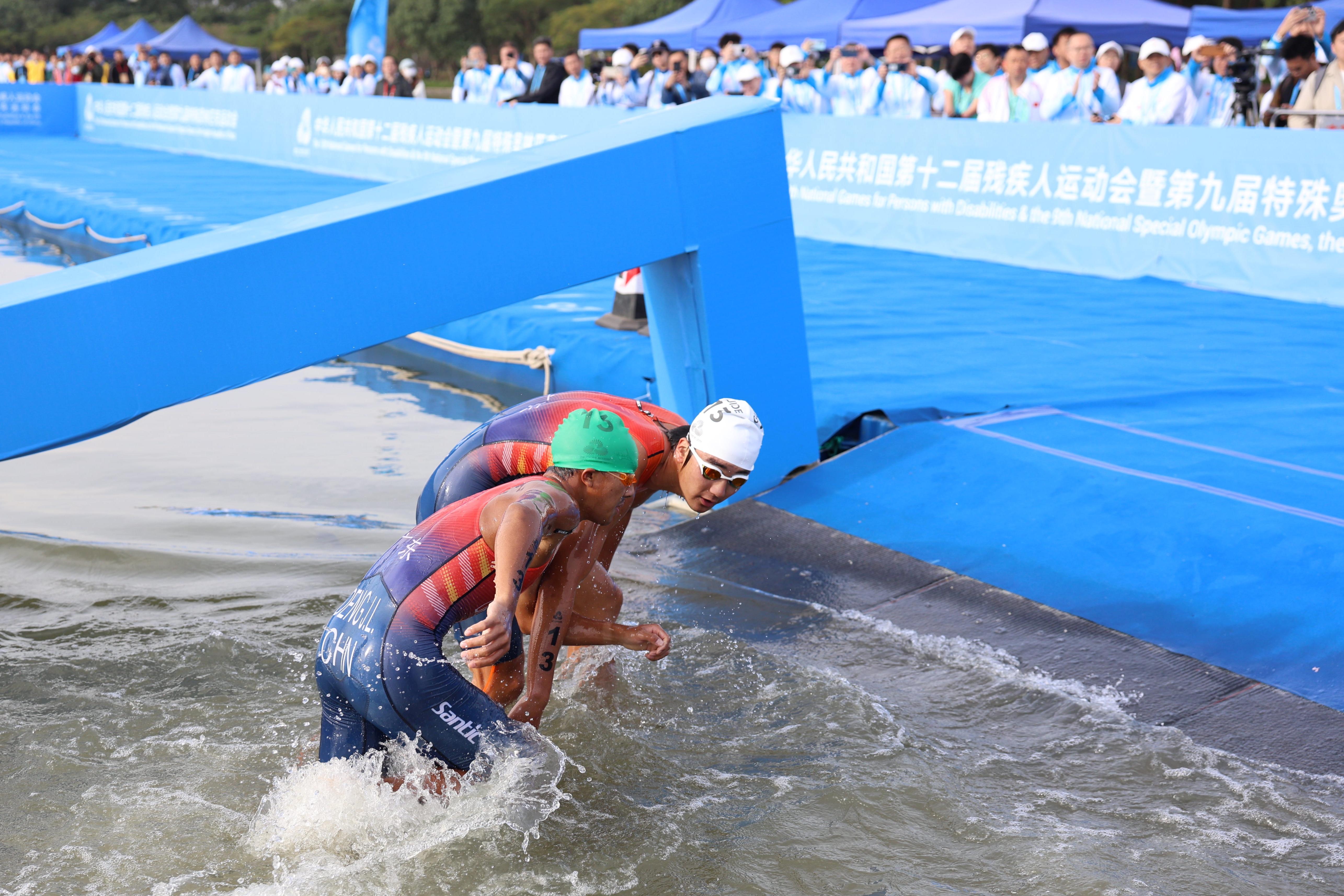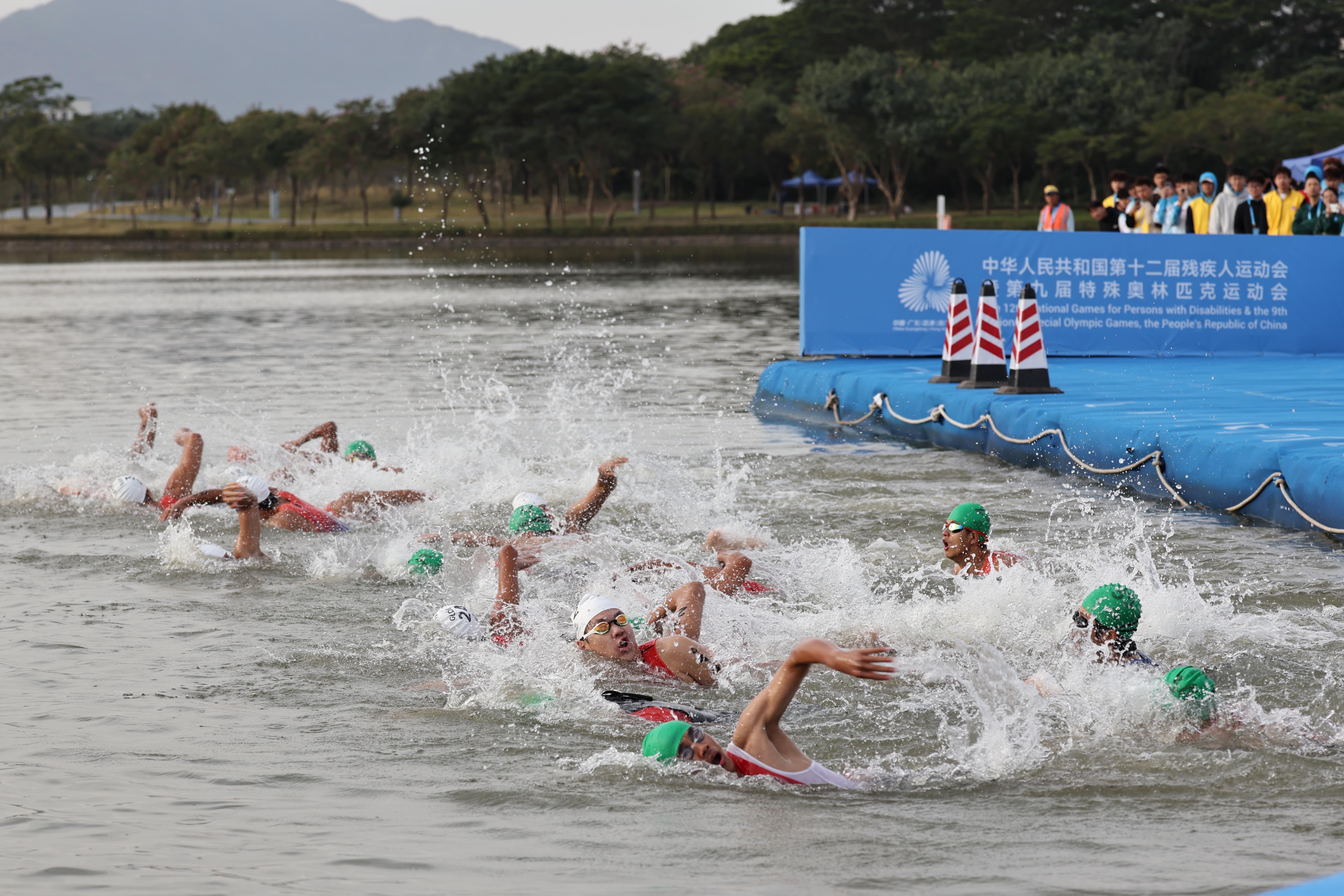 11月27日上午,广东肇庆砚阳湖公园,残特奥会铁人三项开赛,广东铁三队旗开得胜。视障运动员邓建利获残特奥会铁三首金,视障运动员刘泽蛟也一举拿下一金,视障运动员曾美开获得铜牌。