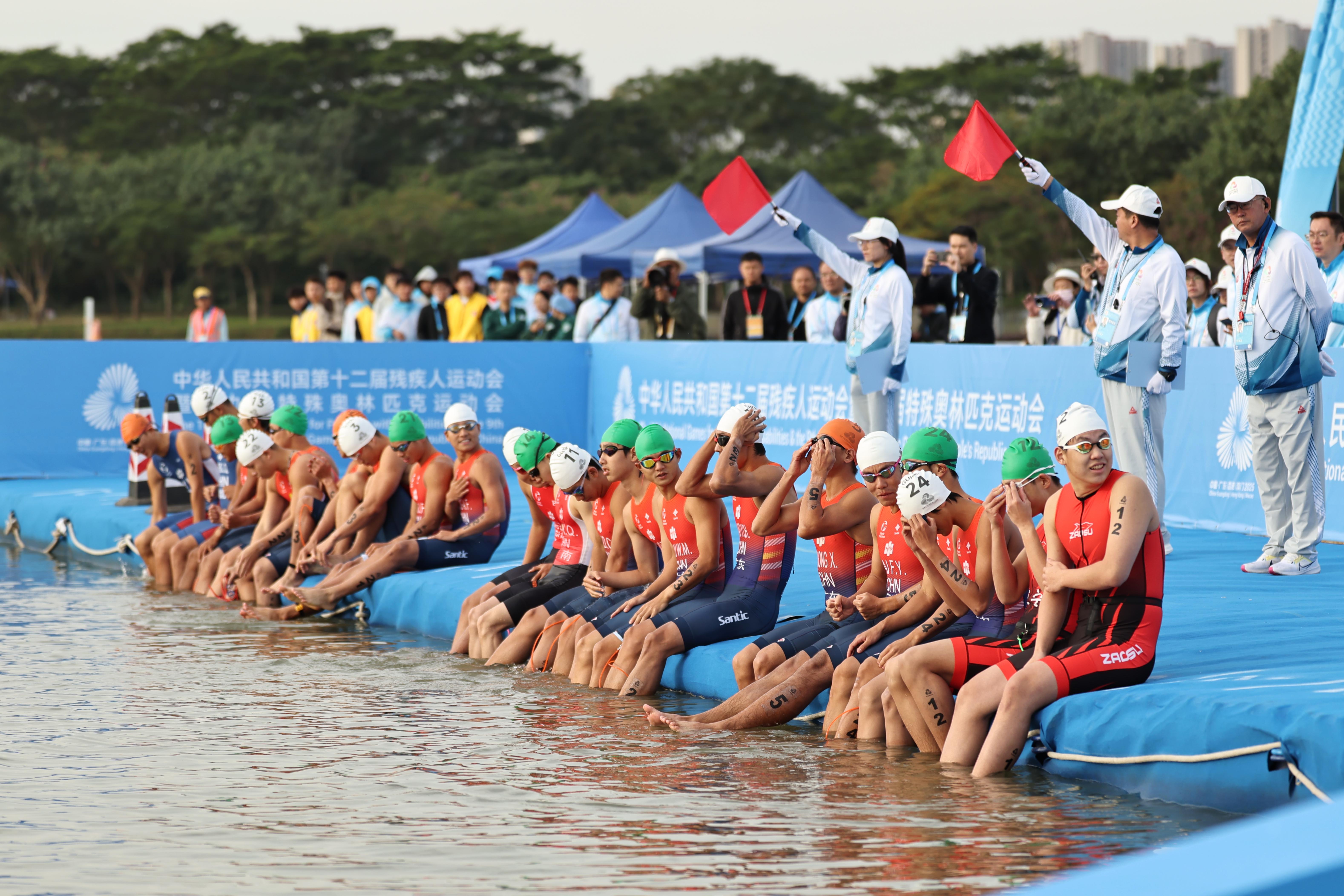 铁人三项是全国残运会首次立项的残奥项目。当天上午,105名来自全国9个省份或地区的十支队伍在此一决胜负。广东一队22名运动员由视障组、肢残组、轮椅组组成,自去年5月开始组队训练,邓建利、刘泽蛟、曾美开等运动员在教练员张兆政的带领下进行了艰苦的准备。