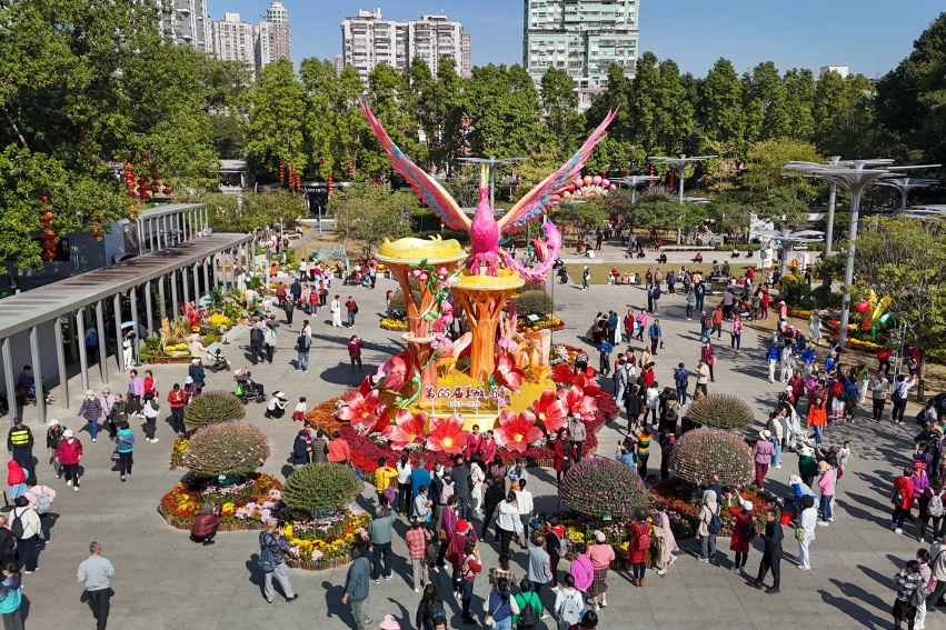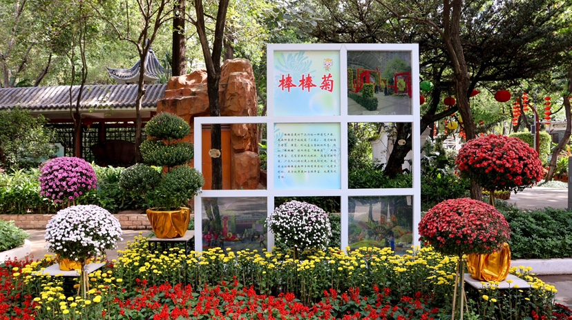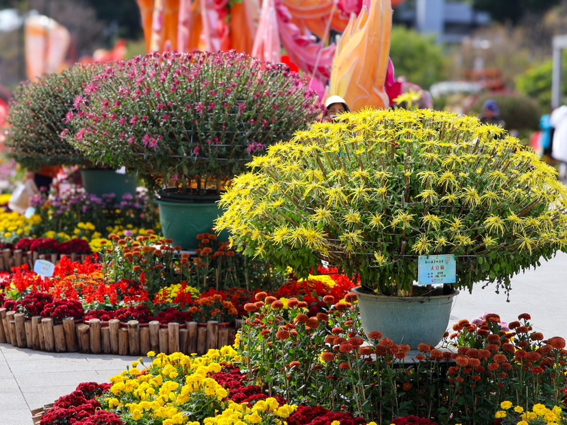 去年广受欢迎的“棒棒菊”今年再度升级,不仅品种与数量显著增多,更通过技术攻关首次实现了多层造型,使其花冠层次更为丰富,色彩表现力也大幅提升。不同品种的棒棒菊相继盛开,使菊球染上了红、黄、白、紫等不同的颜色,更显趣致。位于中心台的“彩色菊球”经过精心培育与布置,以饱满的花色与规整的球形构成壮丽的视觉焦点,深受摄影发烧友的喜爱。而“高放菊”则以1.8米的挺拔身姿,继续其与市民“比高”的趣味互动,平添了许多生气。