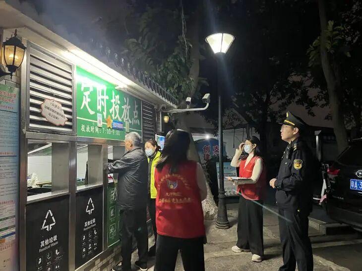 行动中,志愿者与执法人员重点围绕夜间垃圾定时投放点开展督导服务,在投放时段驻守点位,协助居民辨别垃圾类别、规范投放行为,同时解答分类疑问,及时纠正不规范投放问题,提升居民分类准确率。