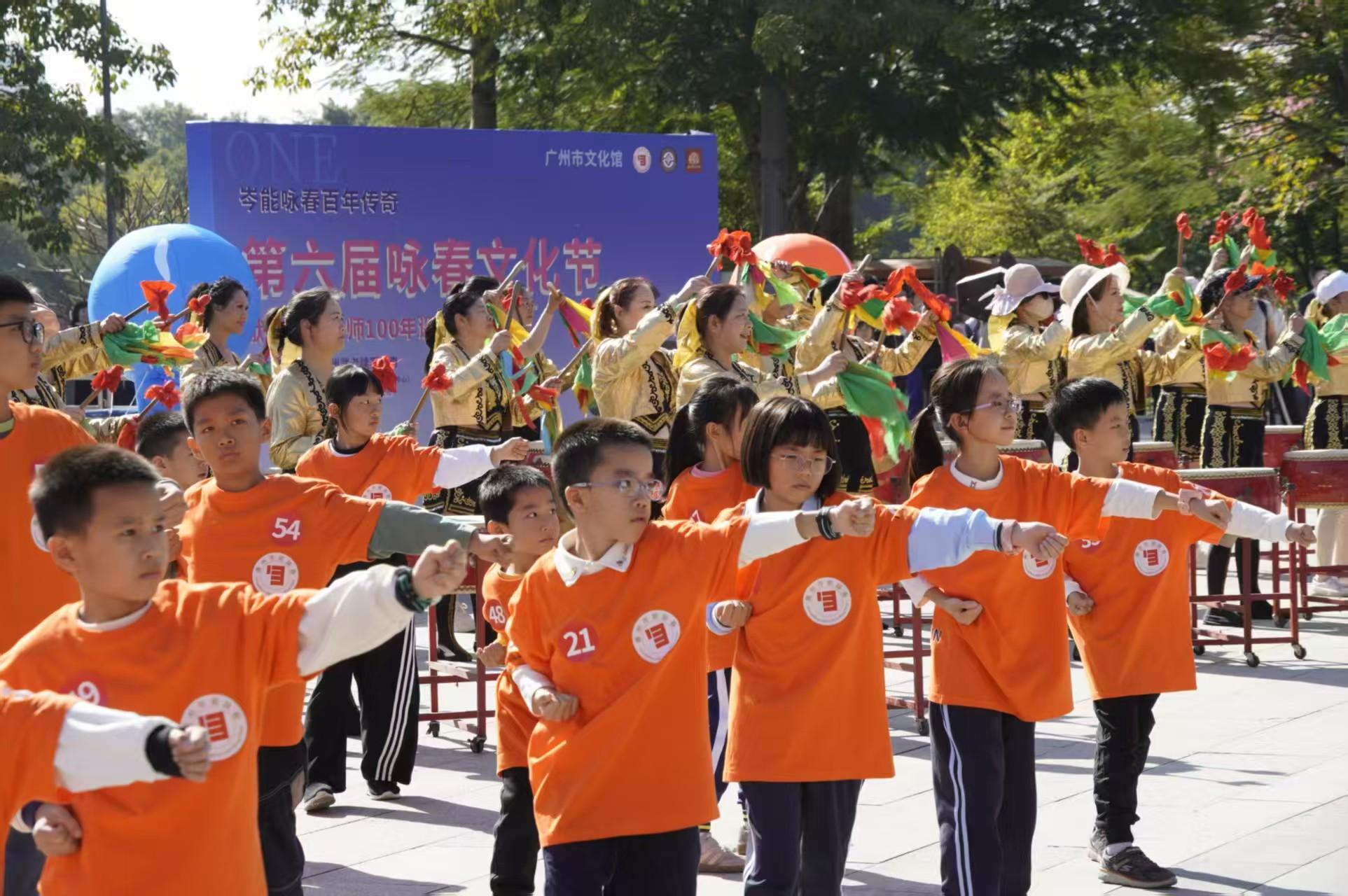 广州市文化馆千人广场上演的千人咏春展演堪称视觉盛宴。广州市第一中学附属詹天佑小学等学校的学子们带来咏春快闪、《咏春鼓武飞扬》《咏春拳操》等表演,将课间操与岑能咏春十二散式相结合,展现青少年传承非遗的蓬勃活力;岑能咏春直系弟子组成的“传统功夫组”与“拓展表演组”,演绎“中线守中、刚柔相济”的技法精髓,尽显“短桥寸劲”的实战魅力。现场还有精彩的咏春街舞、穿插咏春鼓舞与醒狮联动、舞蹈《月光光》等节目,融合粤曲等广府文化元素,呈现出多元文化交融的独特韵味。