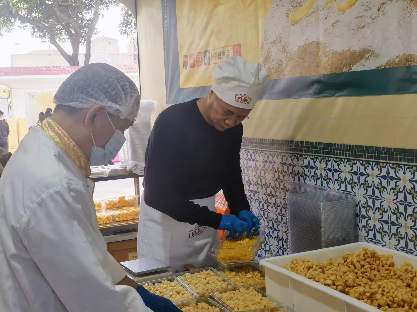与此同时,园内30多项文旅活动同步进行、精彩纷呈,金色大地音乐会、灯光秀、卖花郎巡游、花仙子互动、不倒翁表演等节目轮番上演,小榄名优产品、特色美食和“菊城有礼”文旅产品(手信)展同步亮相,本土特色非遗美食吸引了大批观众。“我们的‘日威菊花饼’在今年刚刚了入选中山市非物质文化遗产名录, 在制作工艺上,我们坚持手工制作,使得饼皮酥松层次分明,内馅清甜回甘,菊香幽远,真正实现了‘看得见的花瓣,嚼得到的菊香’。制作这款非遗美食的初衷是让菊花不止于观赏,更能成为可品尝、可传承的文化记忆,未来希望以其文化底蕴与匠心工艺,成为连接传统与现代、传递菊城情谊的‘金色名片’。”小榄菊花饼制作技艺第四代传承人、日威食品创始人翁坤昌在现场接受记者采访时表示。