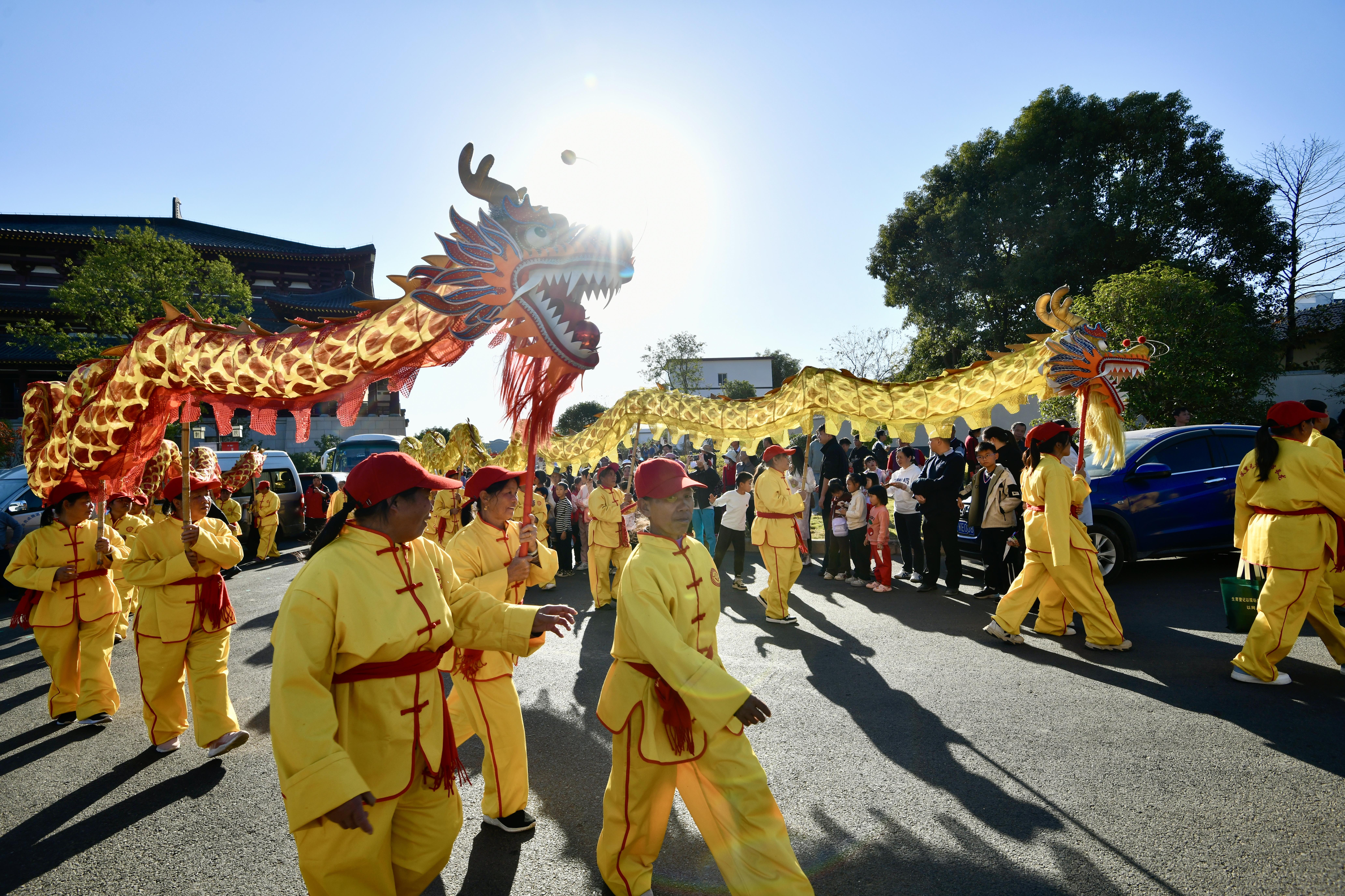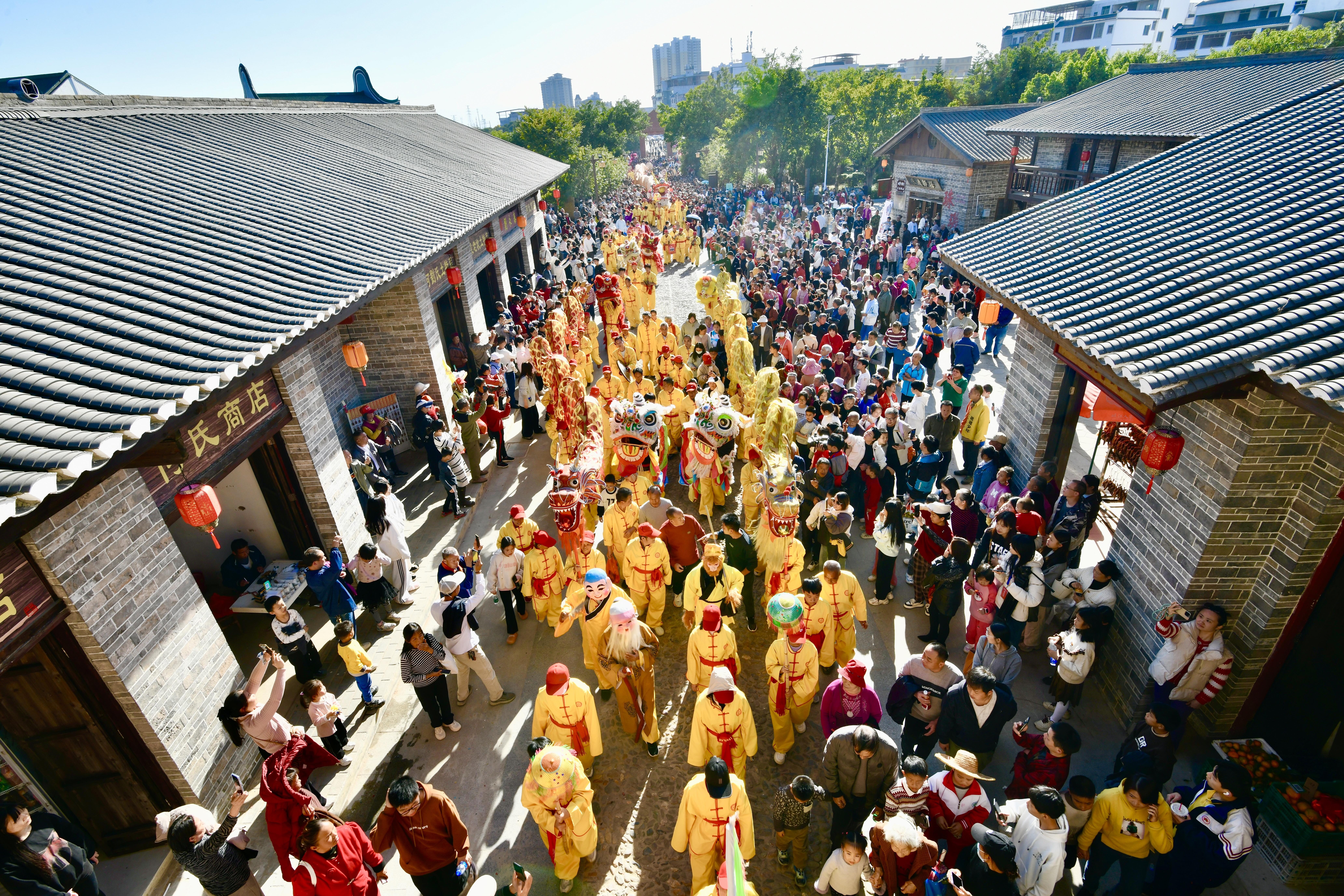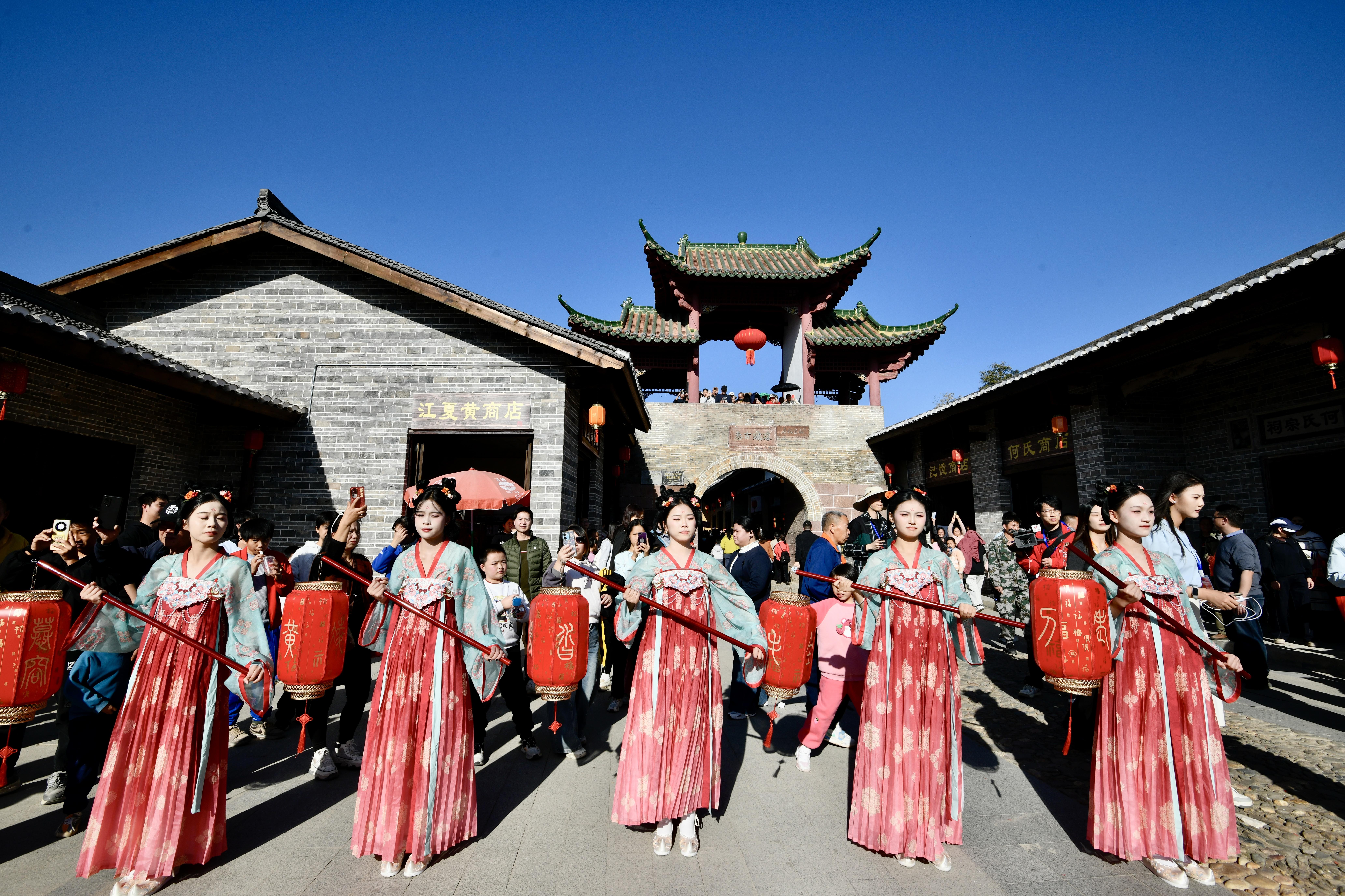 巡游寻根感悟家国情怀,非遗展演尽显岭南活力。除主会场精彩演出外,活动当天还设有多个特色分会场,形成全域联动的文化嘉年华。硅门牌坊广场举行龙狮迎宾仪式,长龙巡游、醒狮献瑞,迎接八方来客;珠玑古巷主巷道及非遗馆的非遗展示区从上午持续至傍晚,集中展示广东省各地市特色非遗代表性项目,粤北采茶戏、雄狮街舞、咏春拳等轮番上演,非遗馆内不仅可赏可购,还能亲手体验制作非遗美食;贯穿全巷的“姓氏寻根”巡游活动,以百家姓灯笼为引,带领游客沿着古道追溯家族根源,在祠堂前感受血脉相连的温情。此外,帽子峰景区、梅关古道还上演银杏主题文化快闪,金叶纷飞中歌舞翩跹,打造“跟着村晚去旅游”的诗意体验。11月24日至30日,结合第五届世界广府人恳亲大会,还同步开展“品非遗美食 促文旅消费”主题活动,推介本地特色产品与文旅资源,推动“文化流量”向“消费增量”转化。