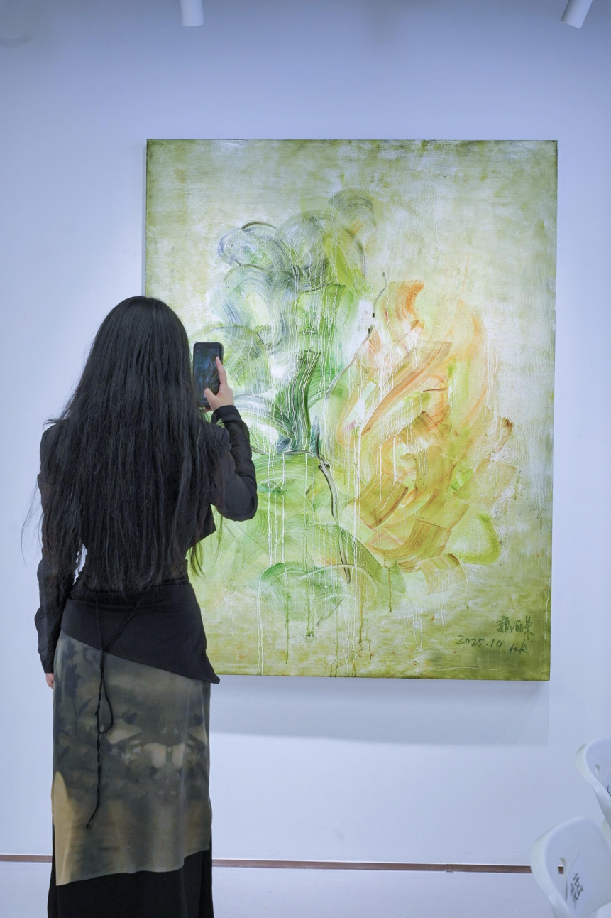 魏丽荣在展览现场说:“‘静默生长’这四个字几乎精准对应了我多年来内心的创作状态。我从北京远道而来,与策展人彭文斌的相遇像是一种缘分,也再次坚定了我在艺术道路上持续深耕的信念。我的创作常常源自生命中的触动,比如作品《庄子·为什么是蝶》的灵感,就来自‘庄周梦蝶’的自由与超脱。我始终希望我的作品能像马蒂斯所说,‘我希望每一位观者看到我的画时能够静下心来。’”