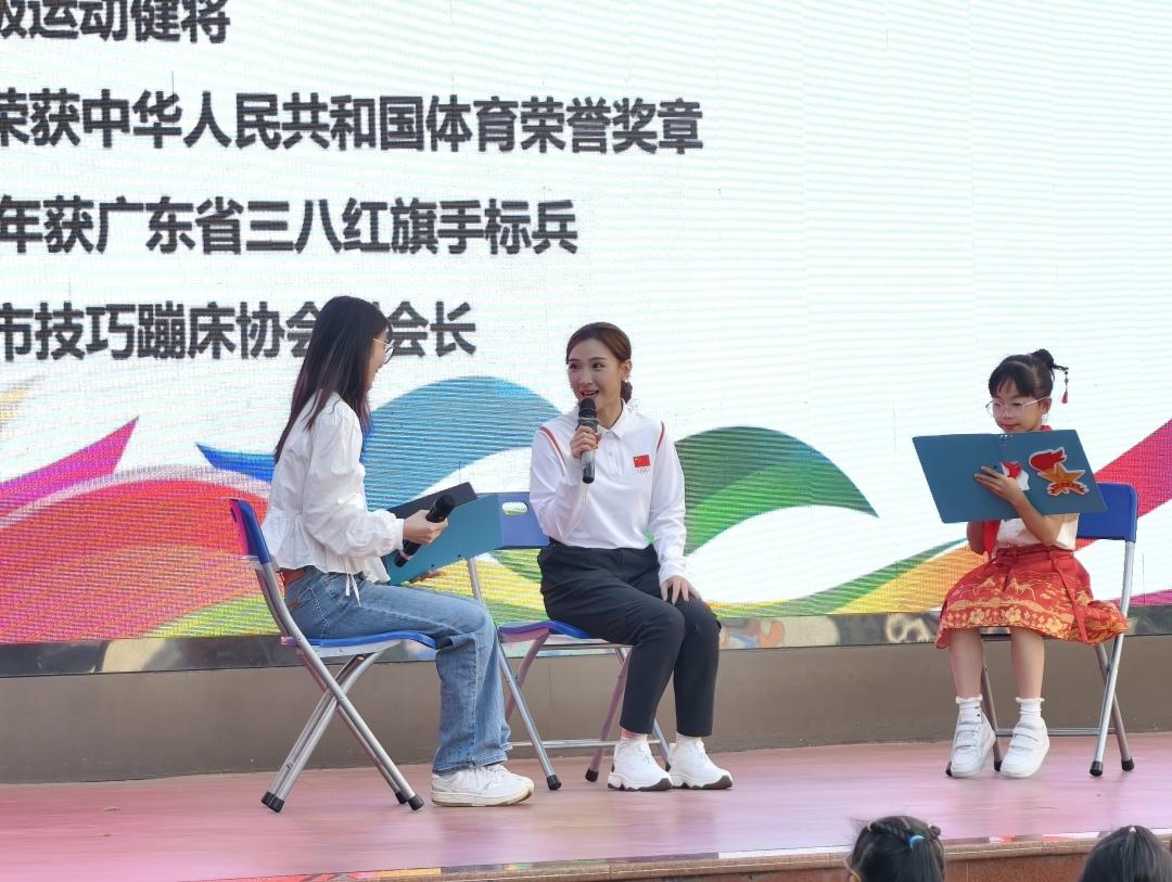 11月26日,广州市海珠区滨江东路小学体育节开幕式上,同学们迎来了世界冠军与火炬“绽放”。十五运会和残特奥会火炬传递工作指挥部专家组组长胡伟京,以及第29届和第31届世界蹦床锦标赛单跳女子团体冠军蔡琪子,向同学们传递积极向上、坚韧不拔的理念。
