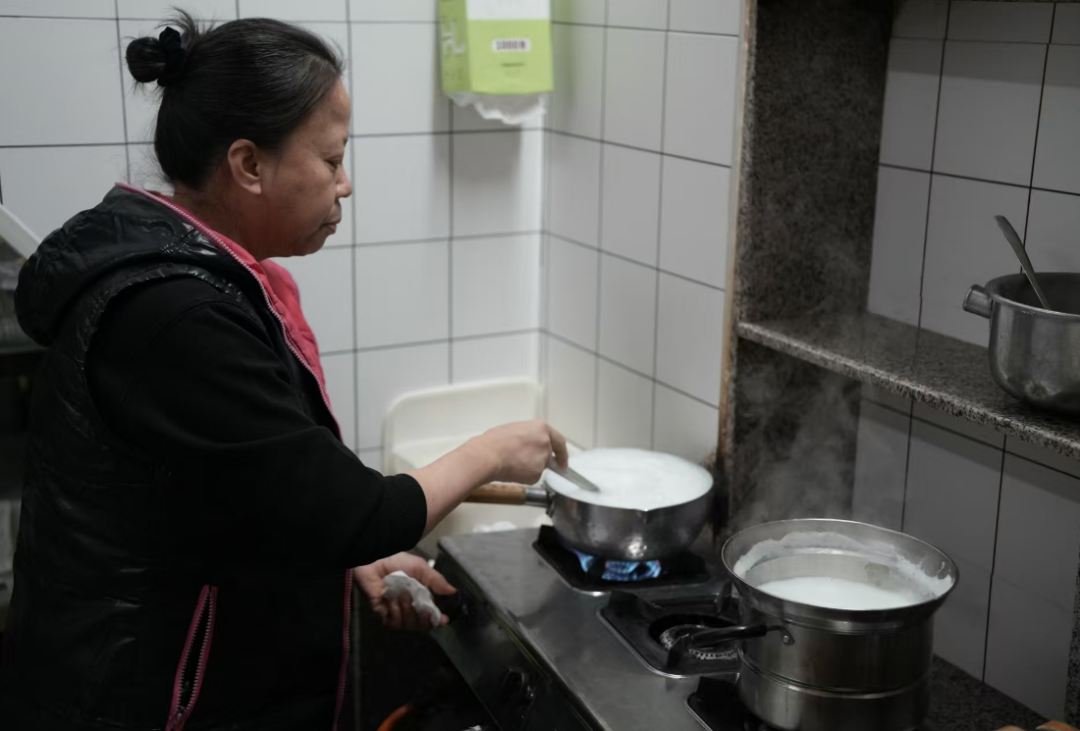 关阿姨一边往锅里续着新鲜牛奶,以前她家里是养牛的,有了牛奶原材料就想着“玩一下”做起甜品生意,哪知道一做就是33年。铝锅咕嘟的声响里,祠堂的影子和糖水的热气缠在一起——33年的甜,熬的是日子,暖的是每个在沙墟村讨生活的人,也暖着“人间烟火最抚人心”的朴素道理。