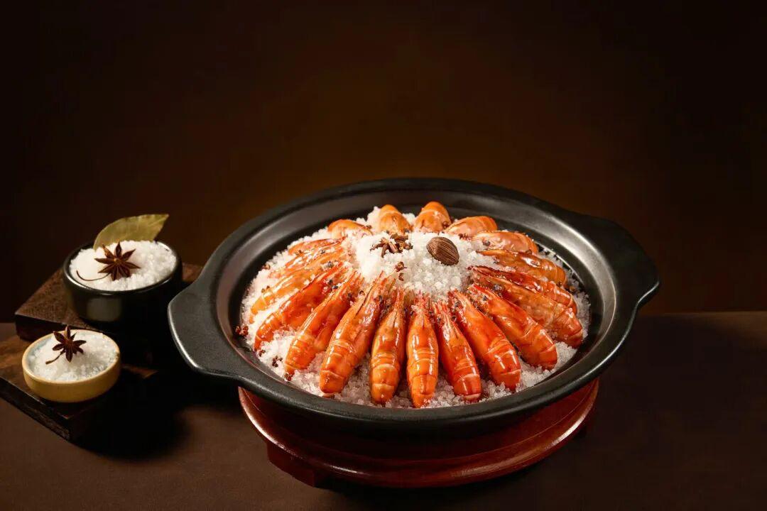 “粤满堂”的每一道菜,都是自然与艺术的融合,是对食材本味的极致尊重。“古法油盐蒸云吞大头鱼”,选用清远笔架山生态放养3年~5年的鱼,喝山泉、食野食,零泥腥气,鱼肉嫩如云朵,入口滑嫩得仿佛能化开,简单的油盐蒸制,锁住了山泉滋养的鲜甜;“古法盐焗罗氏虾”,取阳江深海鲜捕的虾,砂锅粗盐生焗15分钟,不依赖过多调味,只让虾肉的紧实弹牙与天然清甜直窜舌尖,健康又解馋;还有那道招牌“极品黑松露焖鸡”,选用180天乡下放养、足重4斤有余的土鸡项,现劏现煎现焖4分钟锁鲜,鸡肉与鲜黑松露碰撞出浓醇的美拉德香气,皮爽肉滑超入味,每一口都是对匠心的注解。