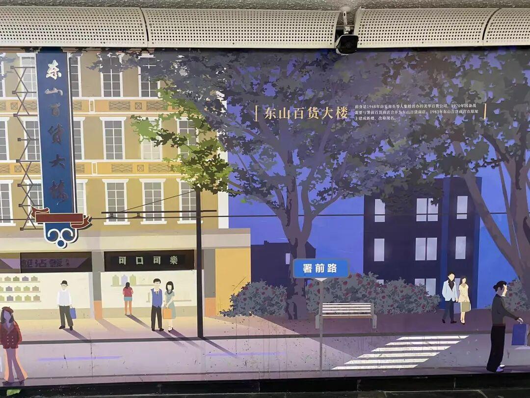前来乘坐地铁的乘客,除了可以在地铁站内消费购物之外,还能在人行隧道里穿梭游行,透过“时光墙”了解东山旧时光。“时光墙”以灯光+平面展览、插画绘制+老照片等形式,将一幅幅精美插画呈现在大众面前。通过新河浦历史文化街区、广九时空列车、东山印象历史老照片等不同展示区域,再现百年东山的生活场景和故事,展示东山的历史文化和人文风情。