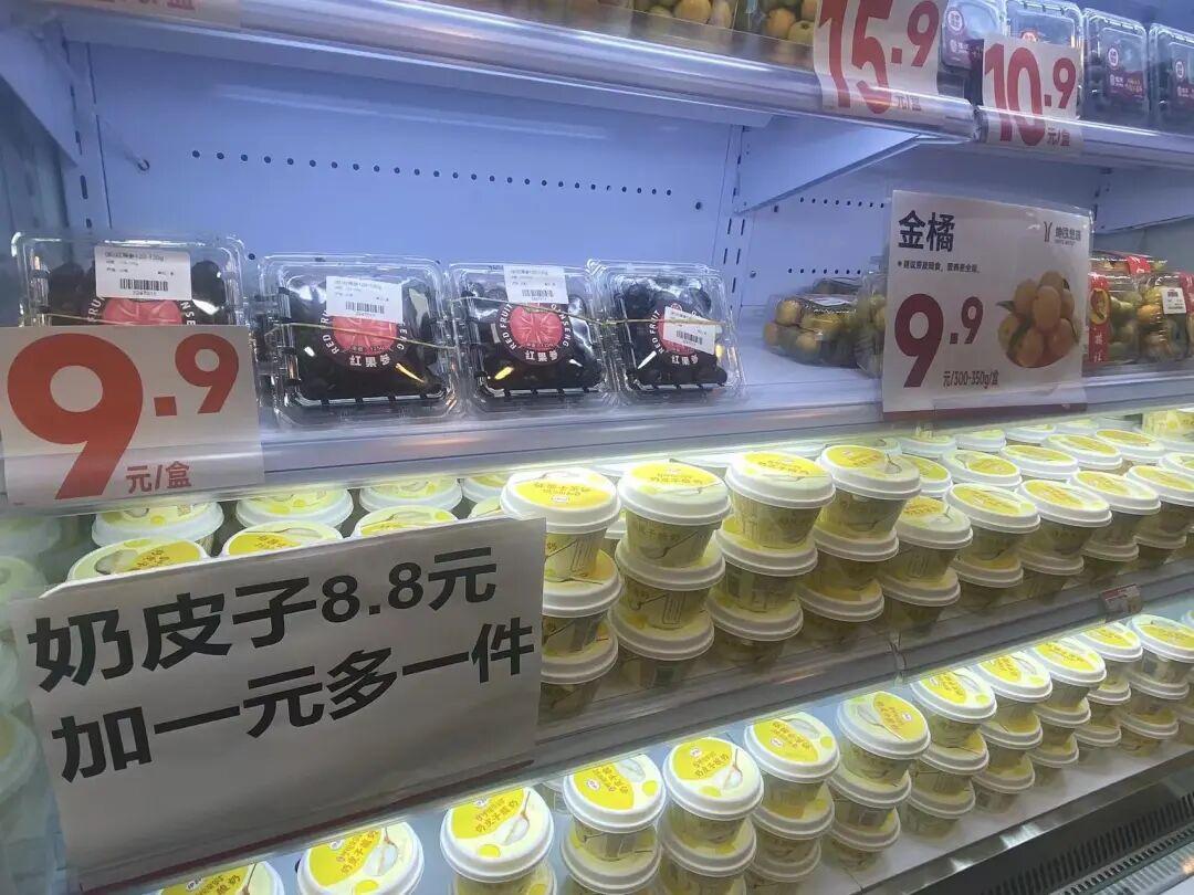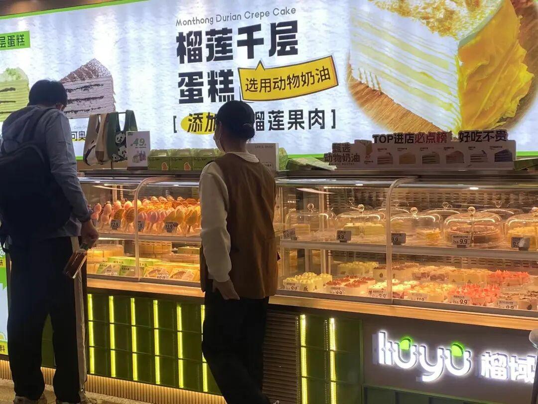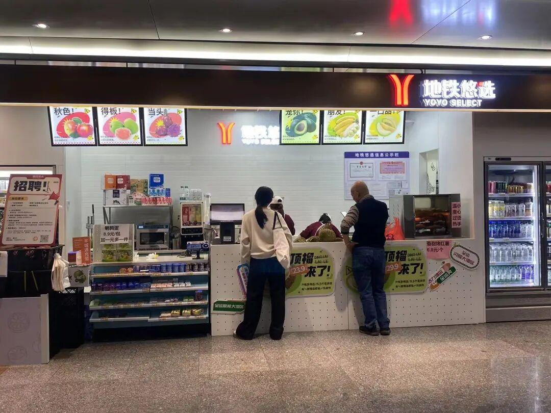 傍晚时分,小e在东山口地铁站“地铁悠选”超市看到,不少乘客正在挑选心仪食品。超市内各类展柜摆放有序,并张贴着面包10元3件、椰青6.9元/个、榴莲蜜薯7.9元/斤等促销海报。